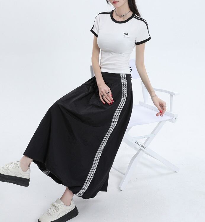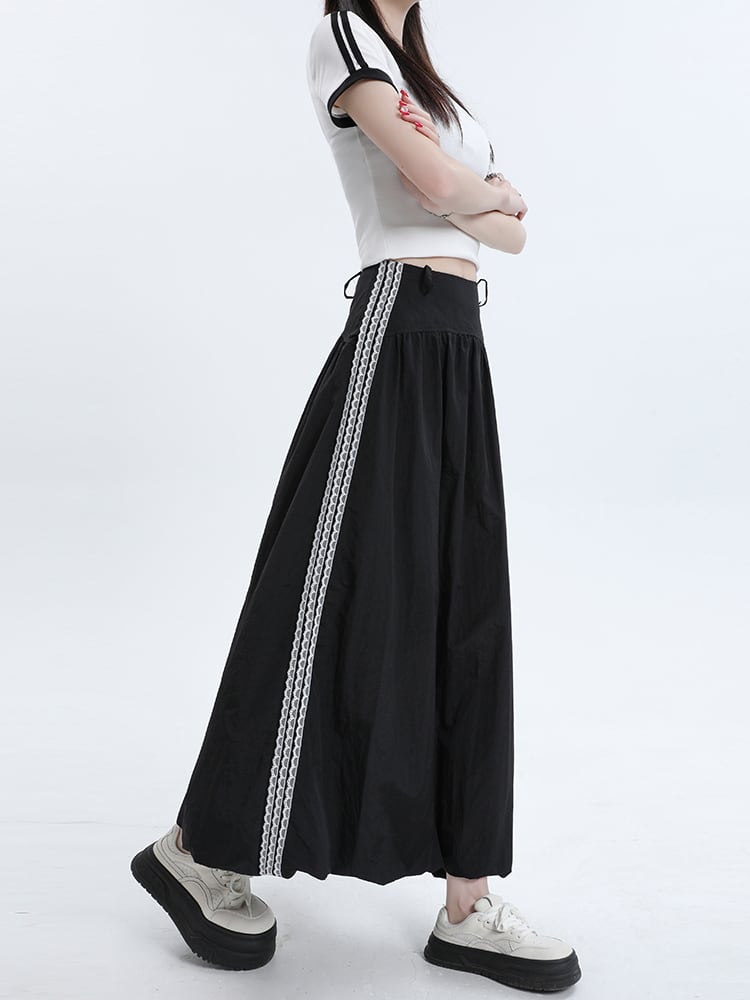 レースの3本ラインがアクセントになった、ハイウエストロングスカート。フェミニンなAラインシルエットが脚長効果を引き出し、大人可愛い印象を与えます。シンプルでありながらも、スポーティーな要素を取り入れたデザインは、カジュアルにもおしゃれなスタイルにも合わせやすい万能アイテムです。春夏秋冬どのシーズンでも着回し可能で、通勤や学生、デート、旅行など様々なシーンに大活躍。体型カバーにも優れた、ゆったりとした履き心地が魅力です。