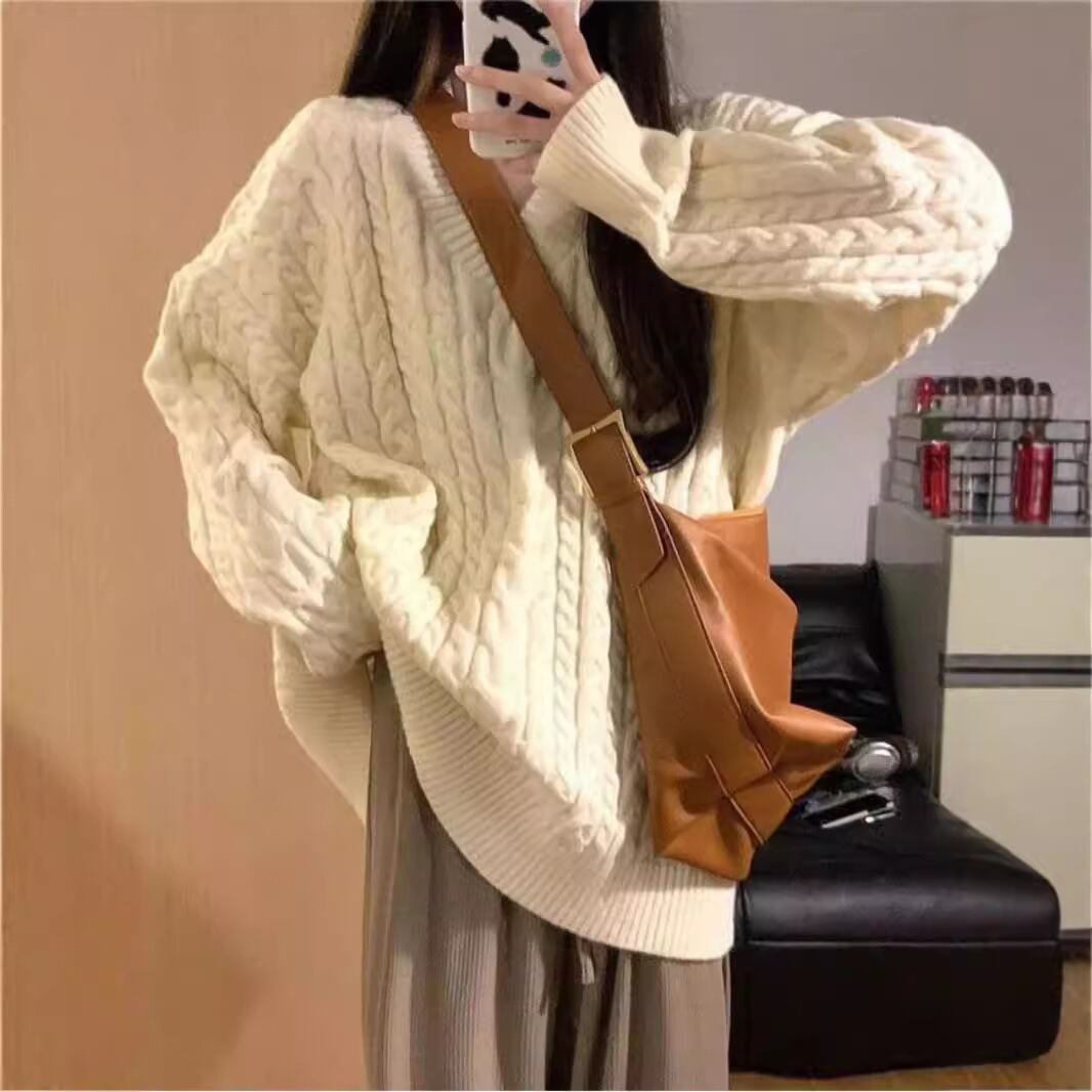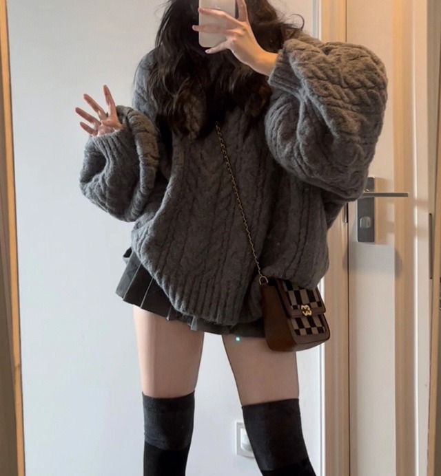 Vネックのケーブル編みルーズニットセーターで、大人可愛い印象を演出する一枚。ボリューム袖とドロップショルダーのデザインが、程よいリラックス感とこなれたスタイルを叶えます。春秋冬のシーズンに活躍する暖かいケーブルニットで、シンプルながらも編み上げデザインがアクセントに。普段使いから通勤、デート、お出かけまで、幅広いシーンに対応。体型カバーにも優れ、M〜4XLの大きいサイズ展開で、ゆったりとした着心地と着回し力も抜群のアイテムです。