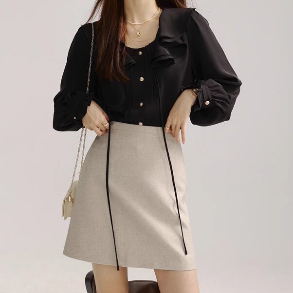 首元のフリルが特徴的なブラウスに、シンプルで洗練されたデザインのスカートのセットアップ。