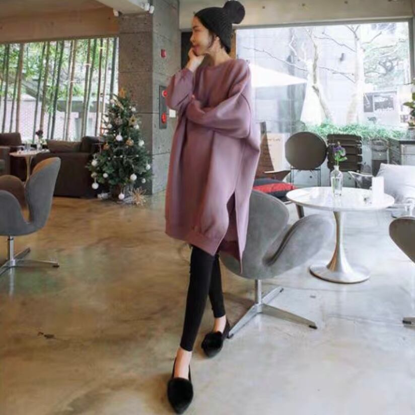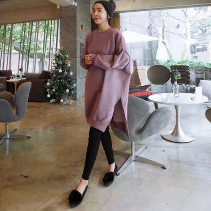 ワンピース スウェット パーカーワンピ サイドスリッド オーバーサイズ ラウンドネック スリッド入り ドロップショルダー 膝丈 ひざ丈 袖あり 長袖 萌え袖 ストレート 大人可愛い きれい シンプル カジュアル 大人 上品 おしゃれ お洒落 かっこいい 大人女子 大人カジュアル クール スタイリッシュ スポーティー モダン 春 秋 冬 S M L XL サイズ展開 レディース デート お出かけ 女子会 休日 韓国 韓国系 オルチャン ファッション コーデ スタイル モテ 美脚 脚長 大人カラー 大人コーデ