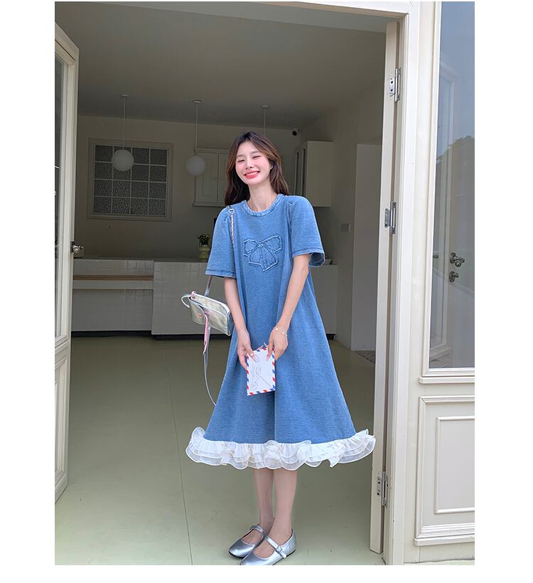 レディース ワンピース デニム 膝丈 膝下 半袖 ラウンドネック ワイド Aライン 切り替え ドッキング 裾ワイド フェミニン フリル 切り替えデザイン かわいい 大人可愛い きれいめ シンプル カジュアル 上品 おしゃれ こなれ感 ラフ ガーリー 存在感 抜け感 ラブリー キュート ベーシック 無地 春 夏 デート お出かけ お泊まり 旅行 公園 女子会 休日 高原 ガーデン ショッピング お花見 合コン カフェ 体型カバー 普段使い モテ 清楚 S M L XL ゆったり ブルー