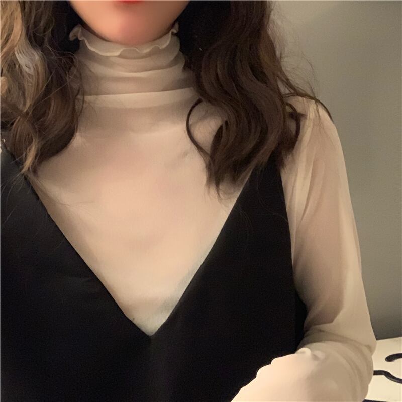 2タイプ メロウフリル シアー トップス レディース プルオーバー インナー 長袖 ハイネック 襟付き スタンドカラー スリム 細身 フェミニン レース 透け感 シースルー 薄手 かわいい 大人可愛い きれいめ シンプル カジュアル 上品 おしゃれ ガーリー 無地 総柄 春 秋 冬 ママ 通勤 学生 学校 通学 デート お出かけ 旅行 公園 女子会 休日 ショッピング カフェ 重ね着 韓国 体型カバー 普段使い 着回し レイヤード 紫外線対策 UV対策 フリーサイズ 黒 ブラック アプリコット