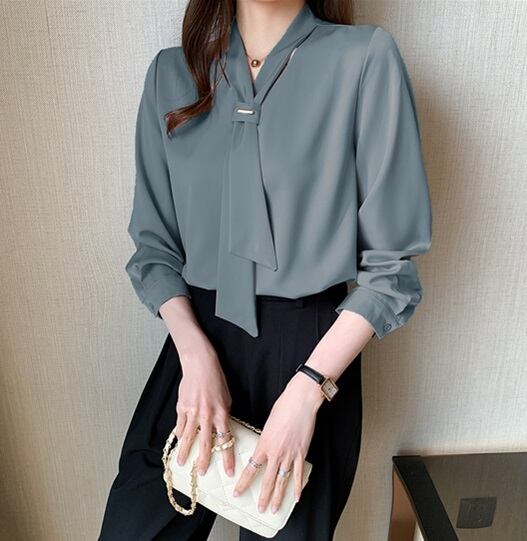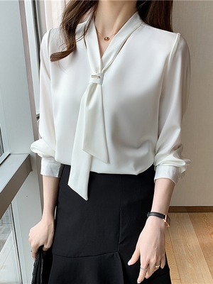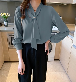 ボウタイリボン 長袖 シフォン シャツブラウスは、上品さと可愛らしさを兼ね備えた一枚です。Vネックデザインで、大人可愛い印象を演出し、襟なしのシンプルなスタイルが魅力!シフォン素材は、春秋冬にぴったりで、さまざまなシーンでの着回しに最適です。オフィスからデート、休日のお出かけまで幅広く活躍すること間違いなしのアイテムです!