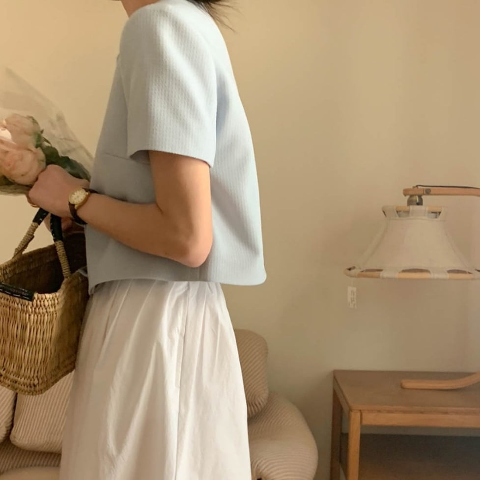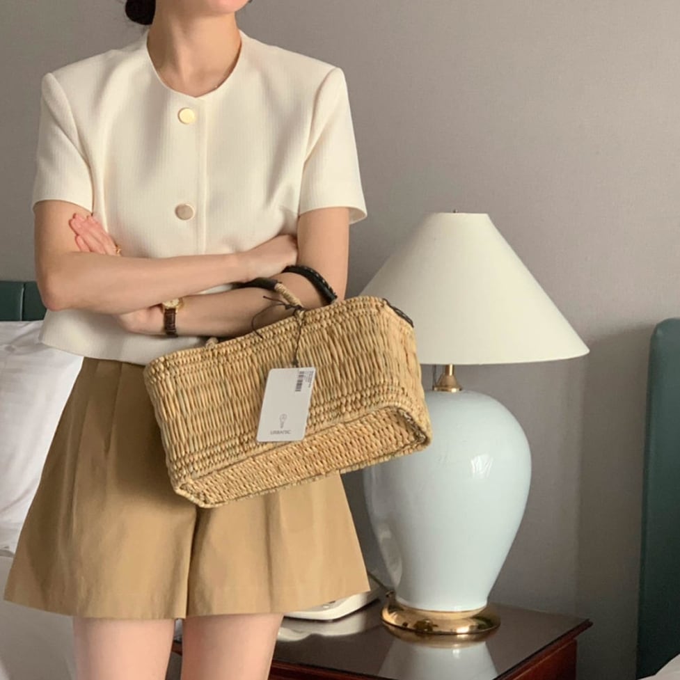 かっちりした風合いで大人上品な半袖ジャケットです。ノーカラーデザインのラウンドネックで首元すっきり。トップスのように1枚で様になるのも嬉しいポイントです