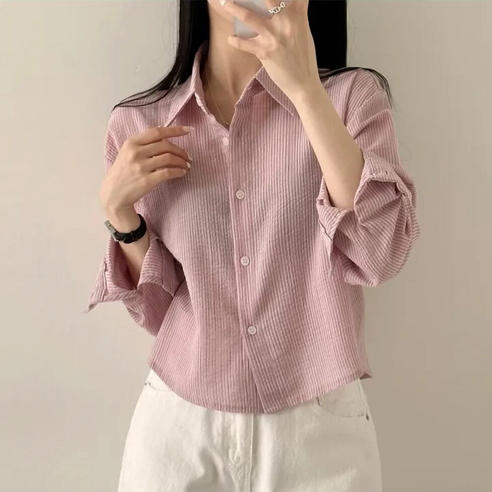 ほんのり透け感がすっきりしたコーデに仕上げてくれるストライプ柄のシャツ。襟付きのデザインなので甘くなりすぎずハンサムな要素をプラスします。トップスとしても羽織って着ても可愛く映えるアイテムです