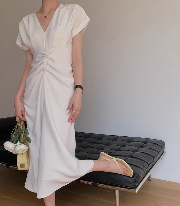 レディース ワンピース サマーワンピ 膝下 ミモレ 半袖 Vネック 襟なし ノーカラー セミフレア タイト 切り替え ウエストマーク ハイウエスト ギャザー 切り替えデザイン かわいい 大人可愛い きれいめ シンプル 上品 おしゃれ エレガント 主役級 存在感 とろみ感 ロマンティック 無地 春 夏 オフィス ビジネス OL 通勤 学生 学校 デート お出かけ 旅行 女子会 合コン コンパ カフェ 韓国 オルチャン コーデ 体型カバー 美脚 脚長 普段使い モテ 清楚 S M L 白 ホワイト