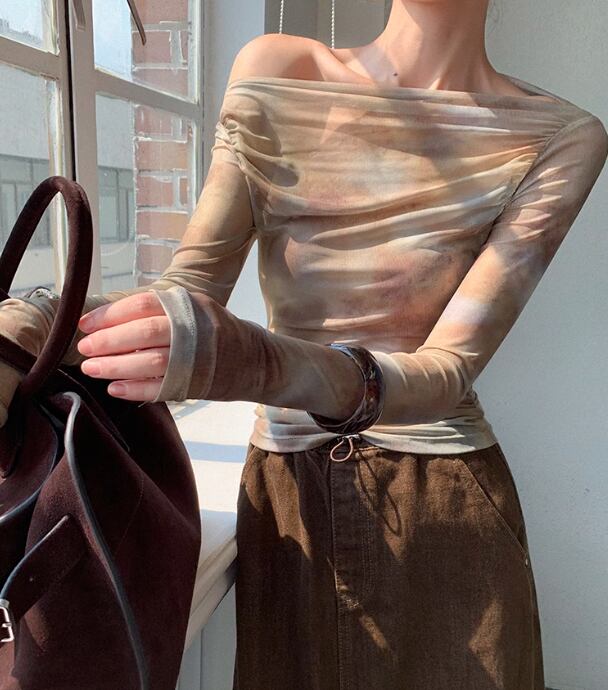 レディース トップス ロンT カットソー 長袖 萌袖 オフショルダー スラッシュドネック オブリークネック タイト スリム 細身 透け感 伸縮性 大人可愛い きれいめ シンプル おしゃれ かっこいい エキゾチック こなれ感 個性的 クール 主役級 存在感 都会的 春 夏 秋 デート お出かけ お泊まり リゾート 旅行 女子会 休日 バカンス ショッピング コンサート ライブ カフェ 韓国 オルチャン コーデ 普段使い 着回し レイヤード モテ トレンド 流行 インスタ映え S M L XL
