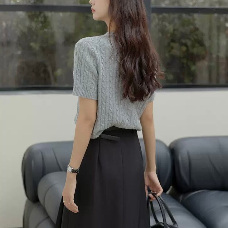 トップス 韓国風 トレンド ニットソー クルーネック ロゴ入り セーター ケーブル編み 袖あり 半袖 襟なし ラウンドネック ケーブルニット 編み込み 伸縮性 ニット 大人可愛い シンプル カジュアル 大人 大人カジュアル 上品 おしゃれ お洒落 大人女子 こなれ感 ラフ モダン セクシー クール 無地 春 夏 秋 冬 オールシーズン シーズンレス デート お出かけ 公園デビュー 女子会 着回し デイリー ヘビロテ 普段使い 韓国 韓国系 オルチャン フリーサイズ 大人カラー カラバリ 大人コーデ