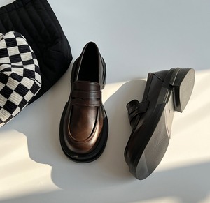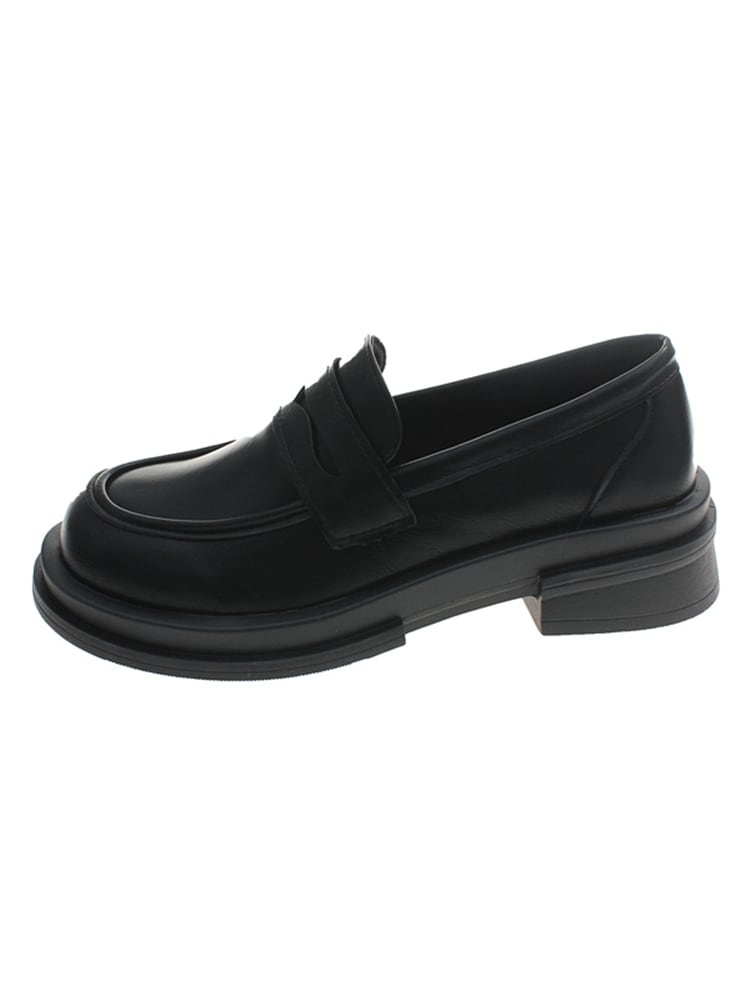 シンプルでありながらおしゃれを楽しめる、PUレザーの厚底ローファーが登場!太ヒールの4.5cm厚底設計で、美脚効果を引き出しつつも歩きやすさを追求しました。ぽっくり感のあるラウンドトゥのデザインは、足元に優しい印象を与え、カジュアルからレトロガーリースタイルまで幅広く対応します。