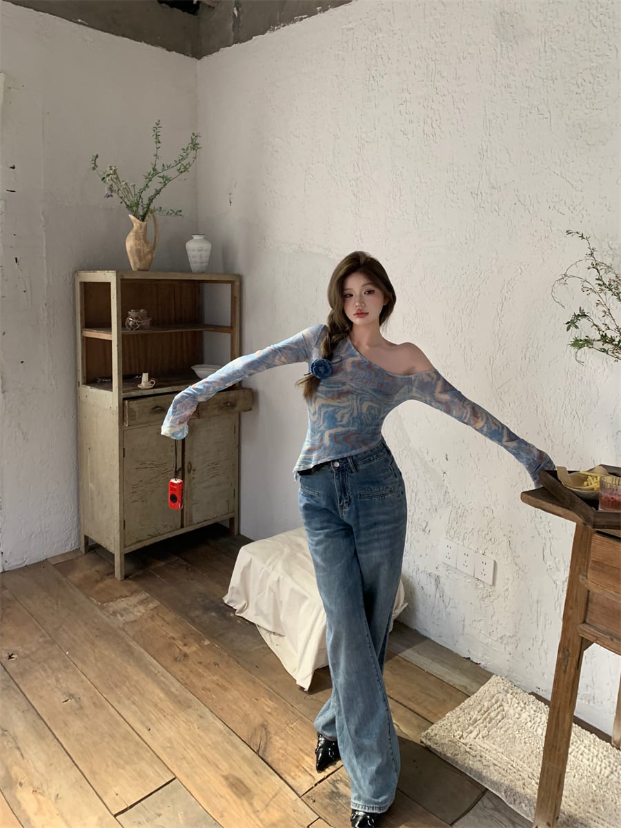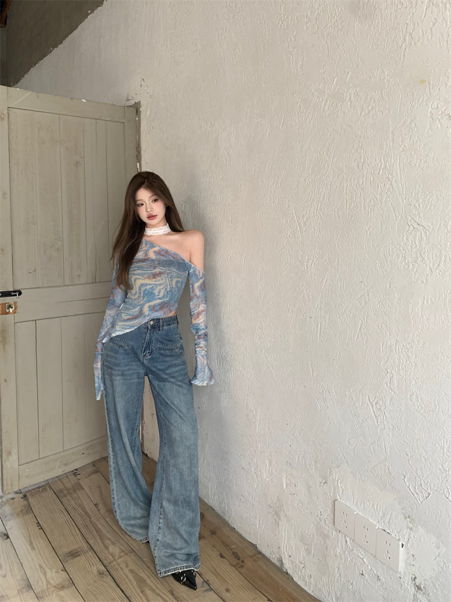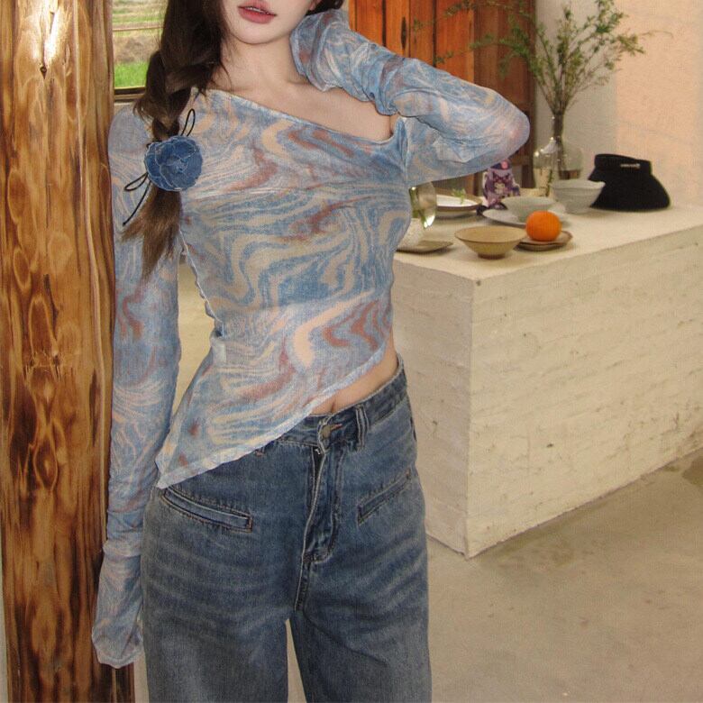 レディース トップス Tシャツ カットソー プルオーバー ショート アシンメトリー 長袖 萌袖 ワンショルダー スリム 細身 フェミニン へそ出し 透け感 シースルー シアー かわいい 大人可愛い きれいめ シンプル カジュアル 上品 おしゃれ こなれ感 ラフ エレガント 存在感 抜け感 アメリカン セクシー マーブル 総柄 春 夏 デート お出かけ お泊まり リゾート 旅行 海 ビーチ 公園 女子会 休日 バカンス 高原 ガーデン ショッピング 普段使い 着回し 紫外線対策 S M L 水色 ブルー