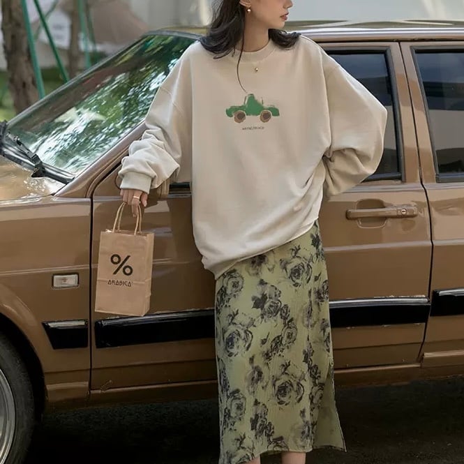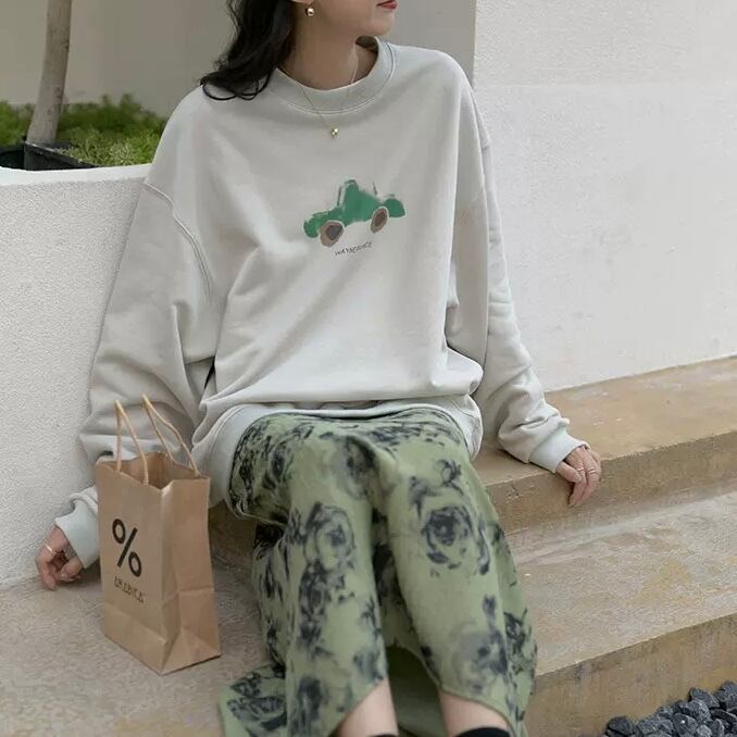 ドロップショルダーのデザインがリラックス感を演出し、萌袖とラウンドネックが可愛らしさを引き立てます。