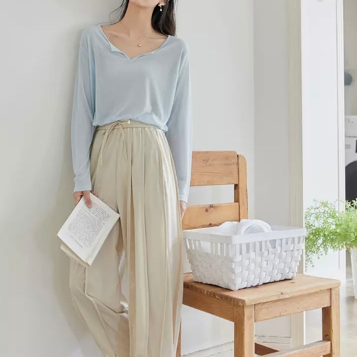 萌え袖感がたまらない、シンプルでありながらもお洒落なVネックデザインが特徴です。