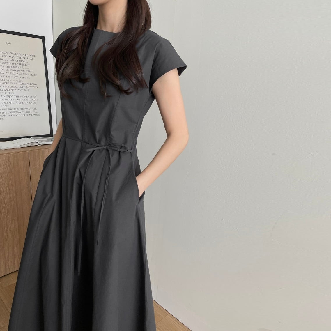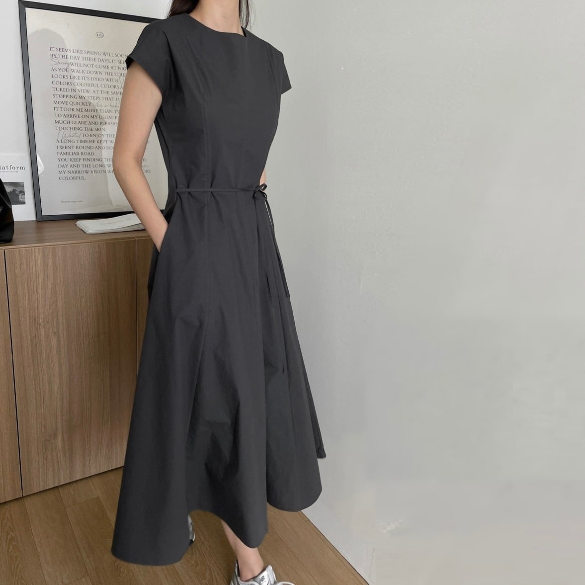 シンプルなデザインで上品な着こなしをかなえるワンピースです。フレンチスリーブで程よい抜け感と二の腕をカバーする効果が期待できます。ウエストの細いリボンがさりげないアクセントで落ち着いた女性らしさを表現します