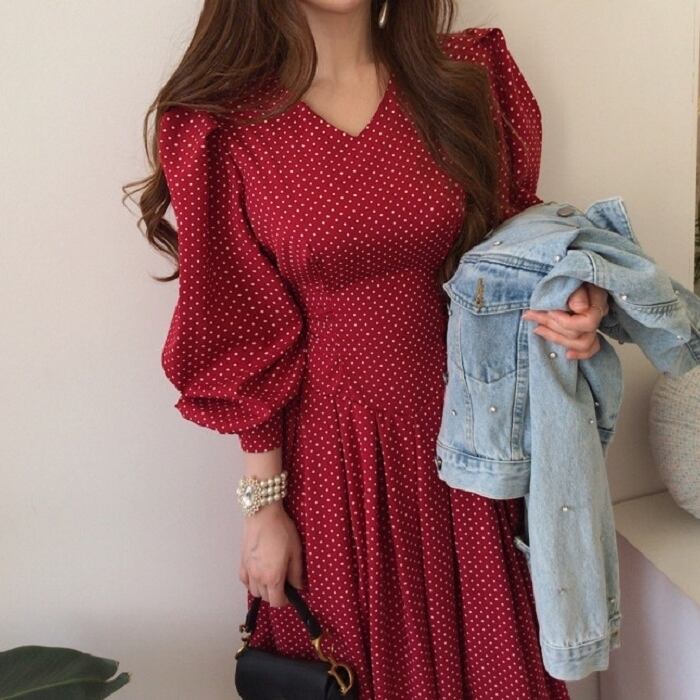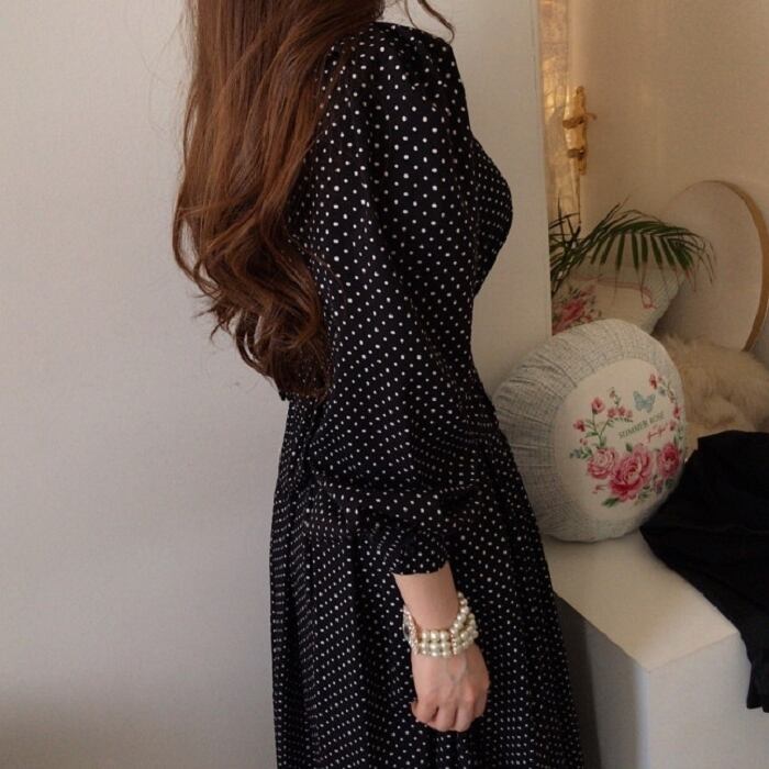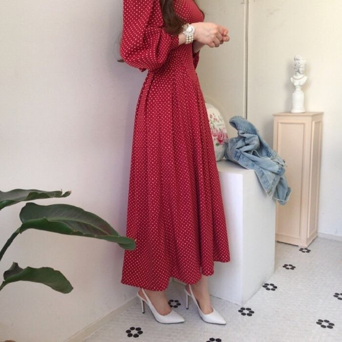 小粒のドット柄が大人ガーリーなロングワンピースです。レトロな袖のディテールが二の腕をカバーしてくれます。ハイウエストのシルエットを強調することでメリハリのついた上品なスタイルを印象付けてくれるアイテムです