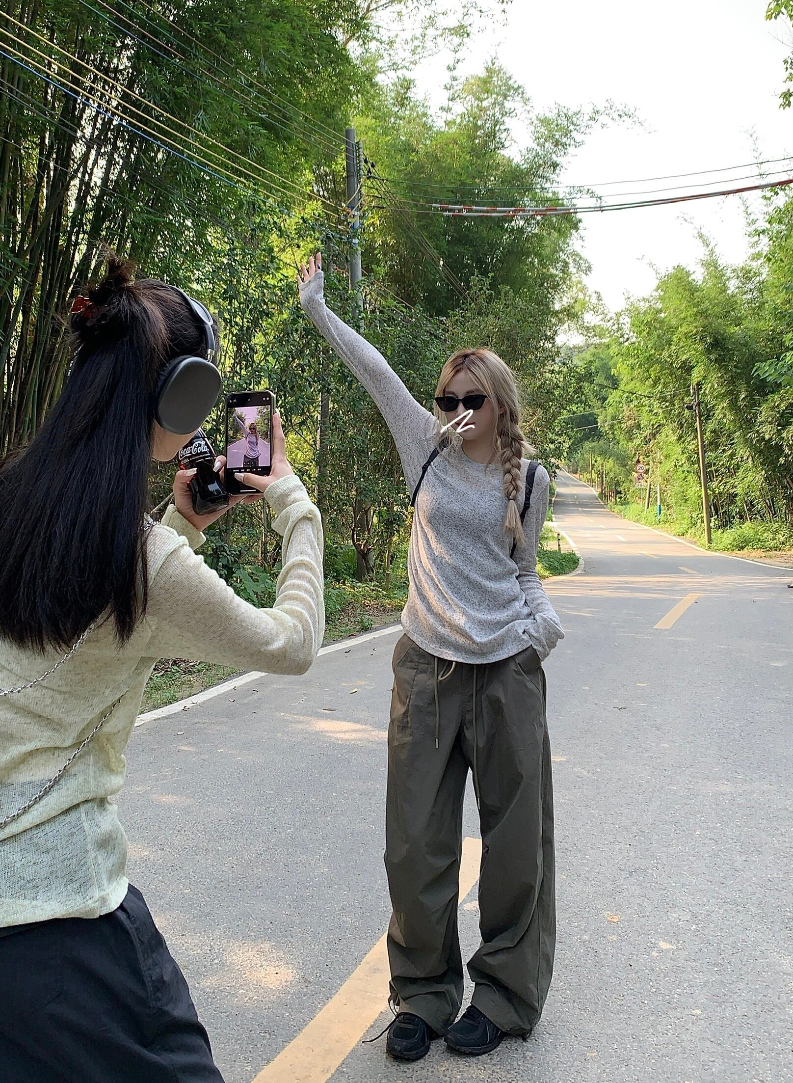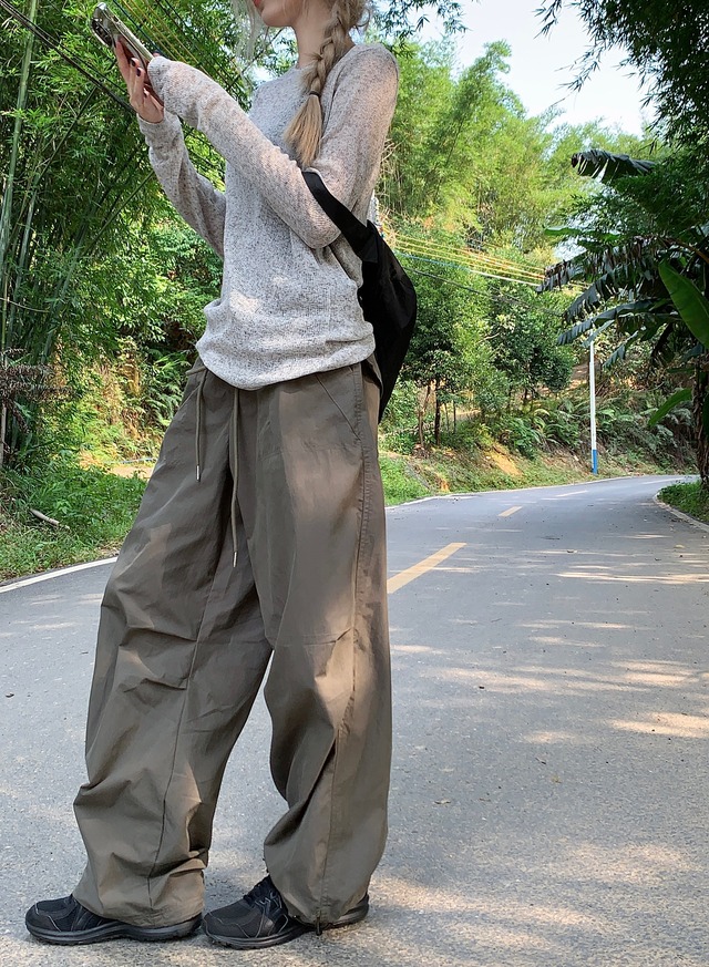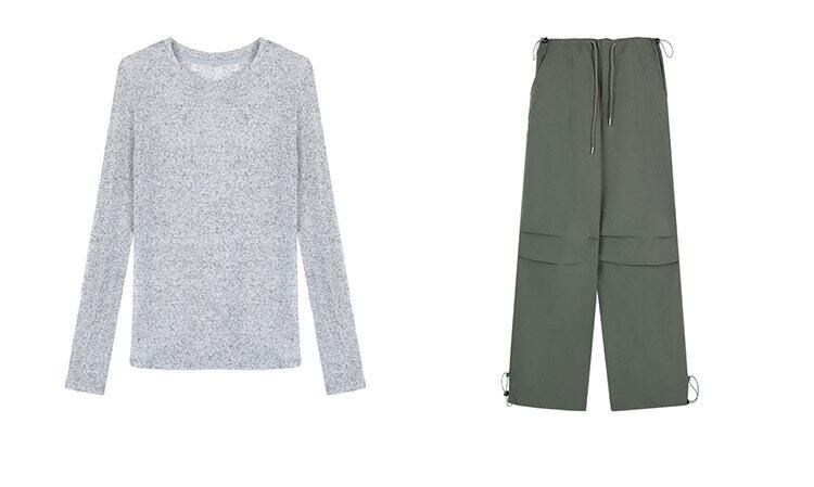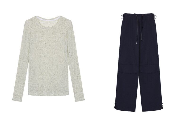 ほどよい透け感と抜け感のある萌袖が魅力的なニットプルオーバーと、シンプルでリラックスしたロングパンツのコンビネーション。