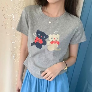 トップス 韓国風 トレンド オルチャン ビーズ付き Tシャツ ショート丈 ヘソ出し カットソー デザイントップス ギャザー ウエスト 肌見せ 袖あり 半袖 ロゴ入 リボン ストレート 大人可愛い きれいめ シンプル カジュアル 大人カジュアル 大人 上品 おしゃれ お洒落 かっこいい 大人女子 こなれ感 ラフ フェミニン セクシー 猫 春 夏 秋 ワンサイズ フリーサイズ デート お出かけ 女子会 休日 リゾート 旅行 着回し 普段使い 韓国 韓国系 大人カラー モテ アプリコット グレー 落ち着いた