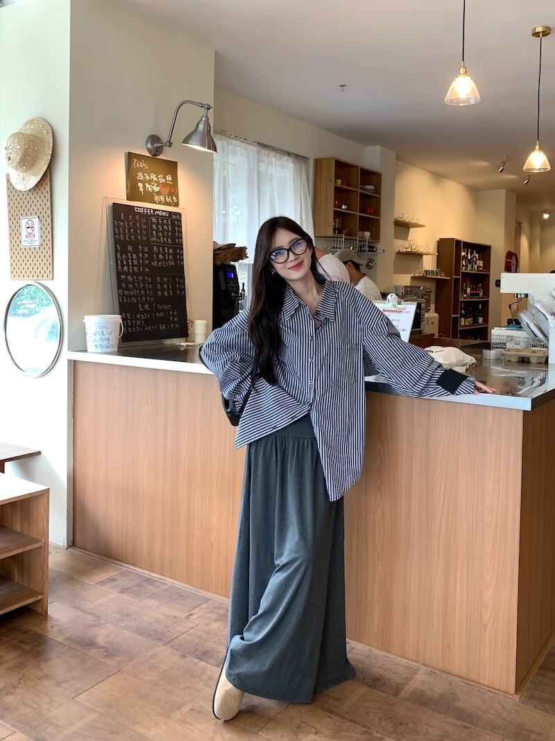 ストライプ柄の長袖シャツと、エレガントなAラインロングスカートの絶妙な組み合わせは、通勤や学校、お出かけにぴったりです。