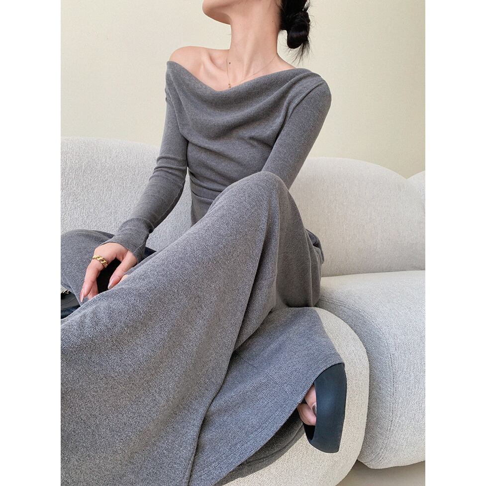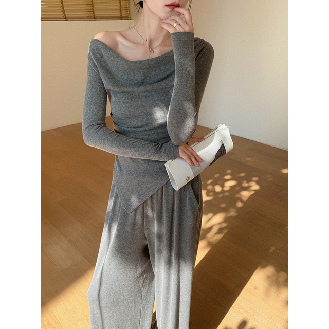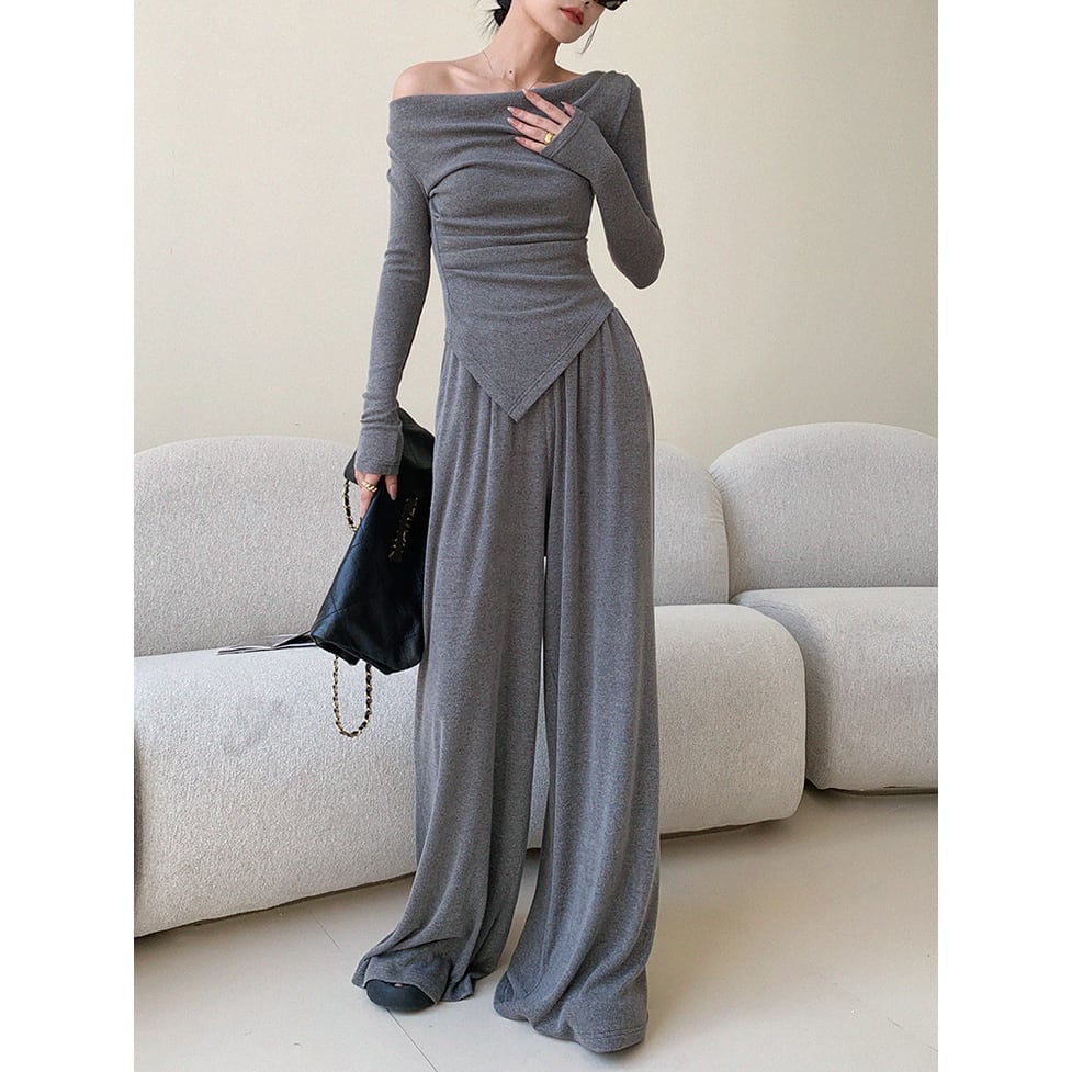 パンツセットアップ オフショルダートップス+ロングワイドパンツセット ツーピース レディース トップス パンツ ボトムス セットアップ オールインワン ロング 長袖 オフショルダー ストレート スマート アシンメトリー ワイド ブーツカット ギャザー セパレート かわいい 大人可愛い きれいめ シンプル カジュアル 上品 おしゃれ かっこいい こなれ感 ラフ マニッシュ ガーリー クール モード系 エレガント キュート ワイルド ゆったり インスタ映え フェミニン