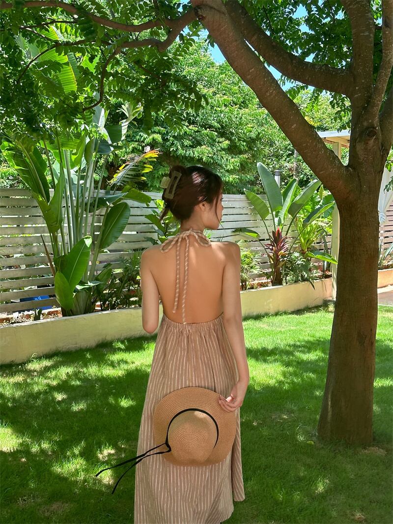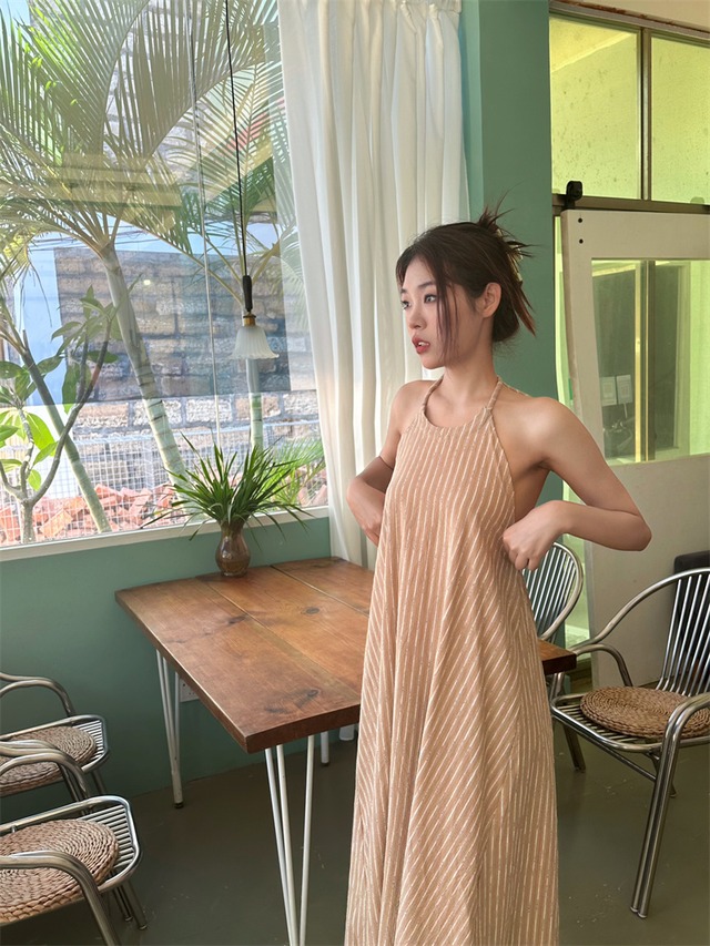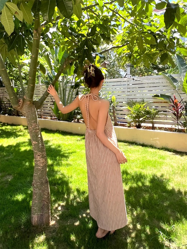 レディース ワンピース キャミソールワンピース ミモレ ロング 袖なし ノースリーブ ホルターネック Aライン 背中開き フェミニン バックコンシャス バックシャン かわいい 大人可愛い きれいめ シンプル カジュアル 上品 おしゃれ こなれ感 抜け感 ラブリー キュート ストライプ 春 夏 デート お出かけ お泊まり リゾート 旅行 海 ビーチ 公園 女子会 休日 バカンス 高原 ガーデン ショッピング 体型カバー 普段使い 着回し モテ 清楚 S M L ゆったり 茶色 ブラウン グレー