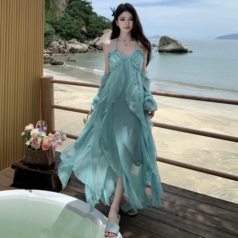 レディース ワンピース キャミソールワンピース ロング ノースリーブ 袖付き 取り外し可能 ホルターネック Aライン 背中開き フェミニン フリル バックコンシャス 透け感 かわいい 大人可愛い きれいめ シンプル カジュアル 上品 おしゃれ こなれ感 ガーリー エレガント 主役級 存在感 抜け感 ラブリー キュート プリンセス フェアリー 無地 春 夏 デート お出かけ お泊まり リゾート 旅行 海 ビーチ 女子会 休日 バカンス モテ 清楚 インスタ映え S M L XL ゆったり 水色 ライトブルー