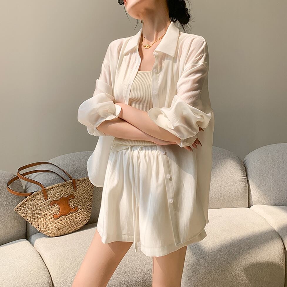 シアーシャツ+ショートパンツセットアップ ゆるシャツ+シフォンパンツセット レディース セットアップ ツーピース トップス パンツ シャツ ブラウス ショートパンツ ショート 膝上 ドロップショルダー 長袖 襟付き セパレート スリット シースルー シフォン シアー かわいい 大人可愛い きれいめ シンプル カジュアル 上品 おしゃれ こなれ感 ラフ マニッシュ ガーリー エレガント 通勤 通学 デート お出かけ イベント 休日 体型カバー インスタ映え ゆったり フェミニン