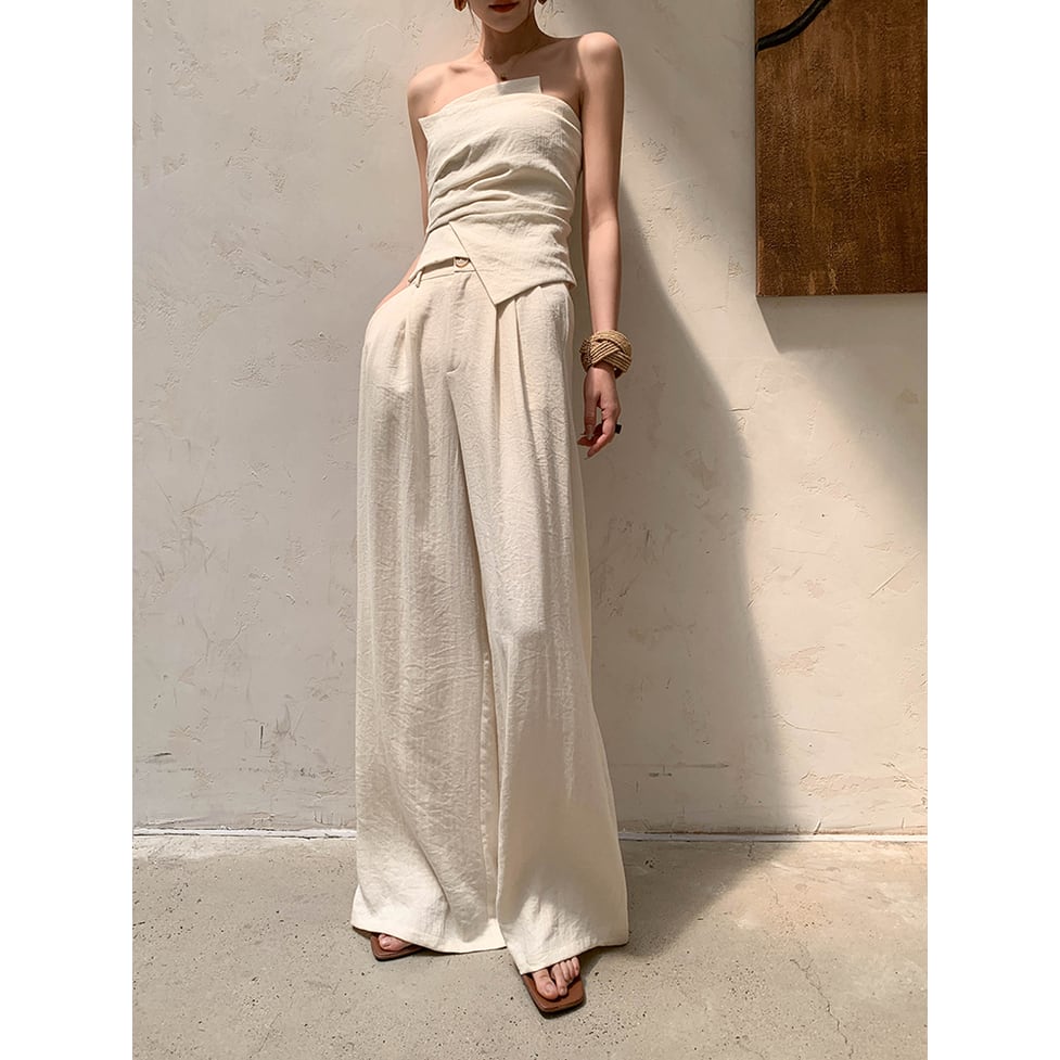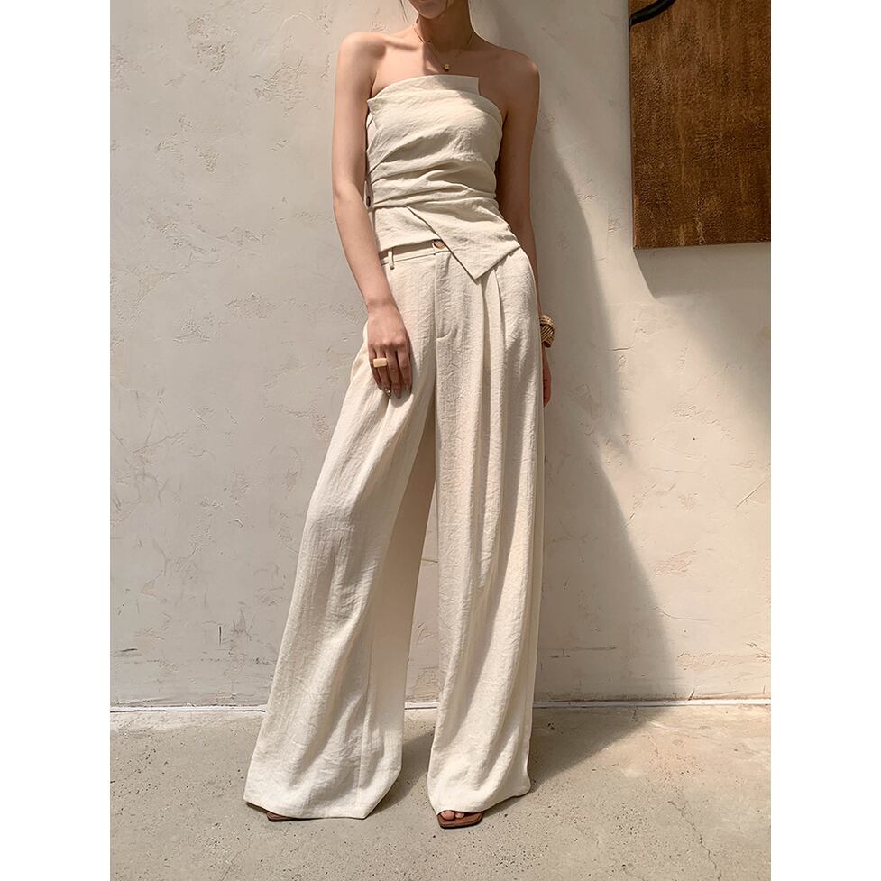 アシンメトリーなタックをきかせたチューブトップとワイドパンツのセットアップです。きちんと感と品格を増幅し気分転換を図れます。軽さをつくると同時に凜とする女性らしさもキープ。単純なスタイリングにひねりを加えワードローブを活性化させる効果的なアイテムです
