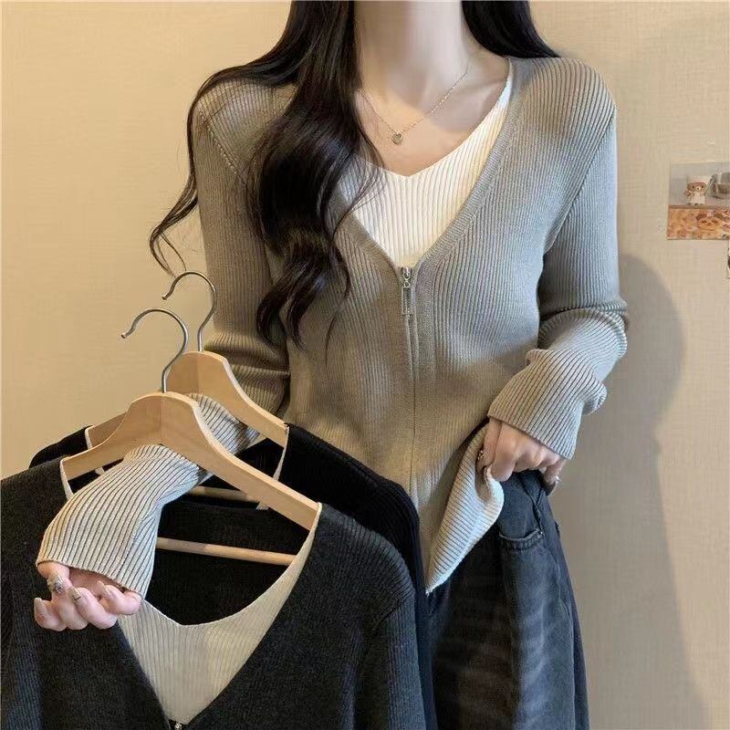 Vネック ジップアップ ニットセーター カーディガン レディース トップス ニット セーター 羽織 長袖 襟なし スリム 細身 ファスナー リブ 前開き リブニット かわいい 大人可愛い きれいめ シンプル カジュアル おしゃれ 無地 春 秋 冬 ママ 通勤 学生 学校 通学 デート お出かけ 旅行 公園 女子会 休日 重ね着 暖かい 普段使い 着回し フリーサイズ 黒 ブラック グレー ブルー キャラメル