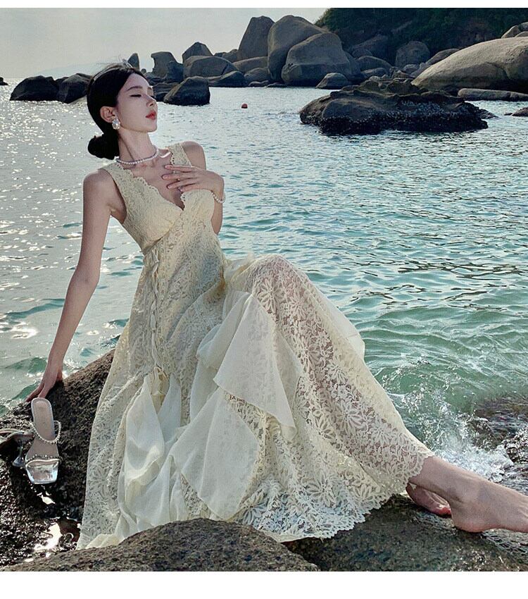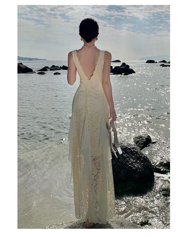 バックコンシャツの背中開きやレースアップがフェミニンさを際立たせ、春夏のデートやパーティー、リゾートスタイルにも最適!