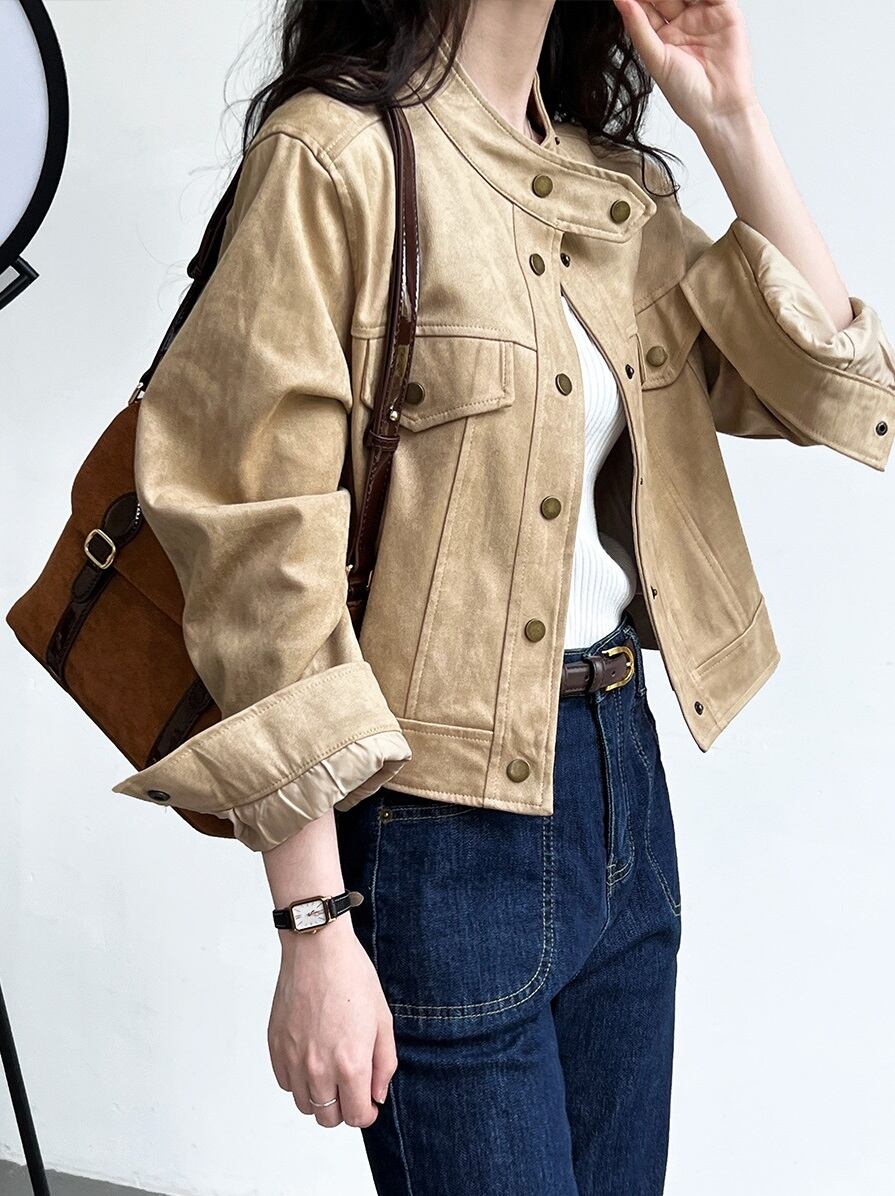 スタイリッシュなショート丈スタンドカラージャケットが登場!大人可愛い雰囲気を醸し出しつつ、カジュアルで上品な一着です。春秋冬とシーズンを問わず、通勤からデート、ショッピングまで幅広くご使用いただけます。前開きのフロントボタンやポケット付きの機能性も嬉しいポイント。シンプルなデザインながら、こなれ感を演出し、さまざまなスタイルに合わせやすいです。