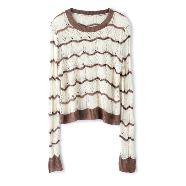レディース トップス ニット セーター プルオーバー ショート 長袖 萌袖 ラウンドネック フェミニン 透かし編み ざっくり編み ローゲージニット 透け感 バイカラー 配色 かわいい 大人可愛い きれいめ シンプル カジュアル 上品 おしゃれ レトロ こなれ感 ラフ ガーリー 抜け感 波状ボーダー 春 秋 オフィス 通勤 学生 学校 通学 デート お出かけ お泊まり 公園 女子会 休日 高原 ガーデン ショッピング カフェ 普段使い 着回し モテ 清楚 S M L XL 2XL ゆったり 茶色 ブラウン