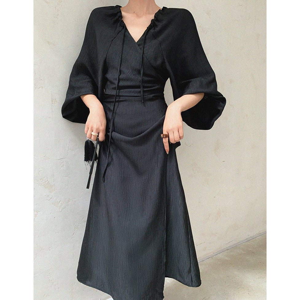 ドロストカシュクールワンピース シアーカシュクールワンピース レディース ドレス ドレスワンピース ワンピドレス ミモレ ロング ボリューム袖 ラグランスリーブ 長袖 Vネック カシュクール ストレート スマート スリム 細身 シフォン 透け感 シアー ドローストリング かわいい 大人可愛い きれいめ カジュアル 上品 おしゃれ レトロ こなれ感 ガーリー 個性的 エレガント キュート 通勤 通学 デート お出かけ イベント 休日 ショッピング ゆったり 体型カバー フェミニン