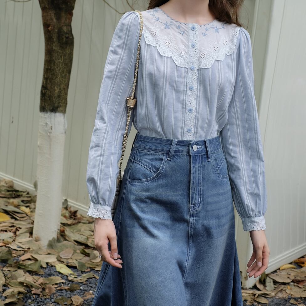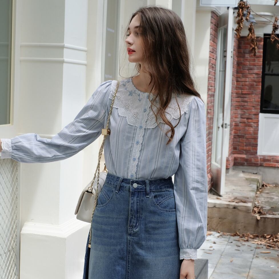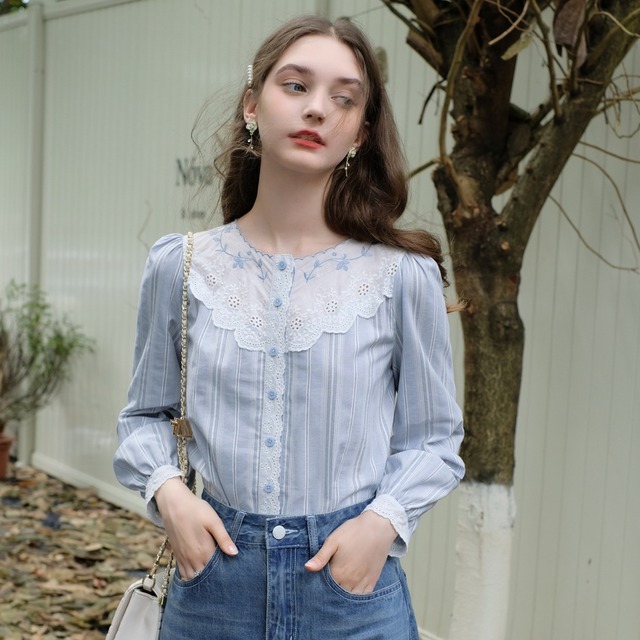 レース付きストライプシャツ ノーカラーストライプレースシャツ レディース トップス シャツ ブラウス 長袖 クルーネック ラウンドネック ノーカラー スマート スリム 細身 切り替え シフォン レース かわいい 大人可愛い きれいめ カジュアル 上品 おしゃれ レトロ こなれ感 ガーリー エレガント キュート ロマンティック ストライプ 通勤 通学 デート お出かけ イベント 女子会 休日 ショッピング 体型カバー 普段使い モテ 清楚 トレンド インスタ映え フェミニン
