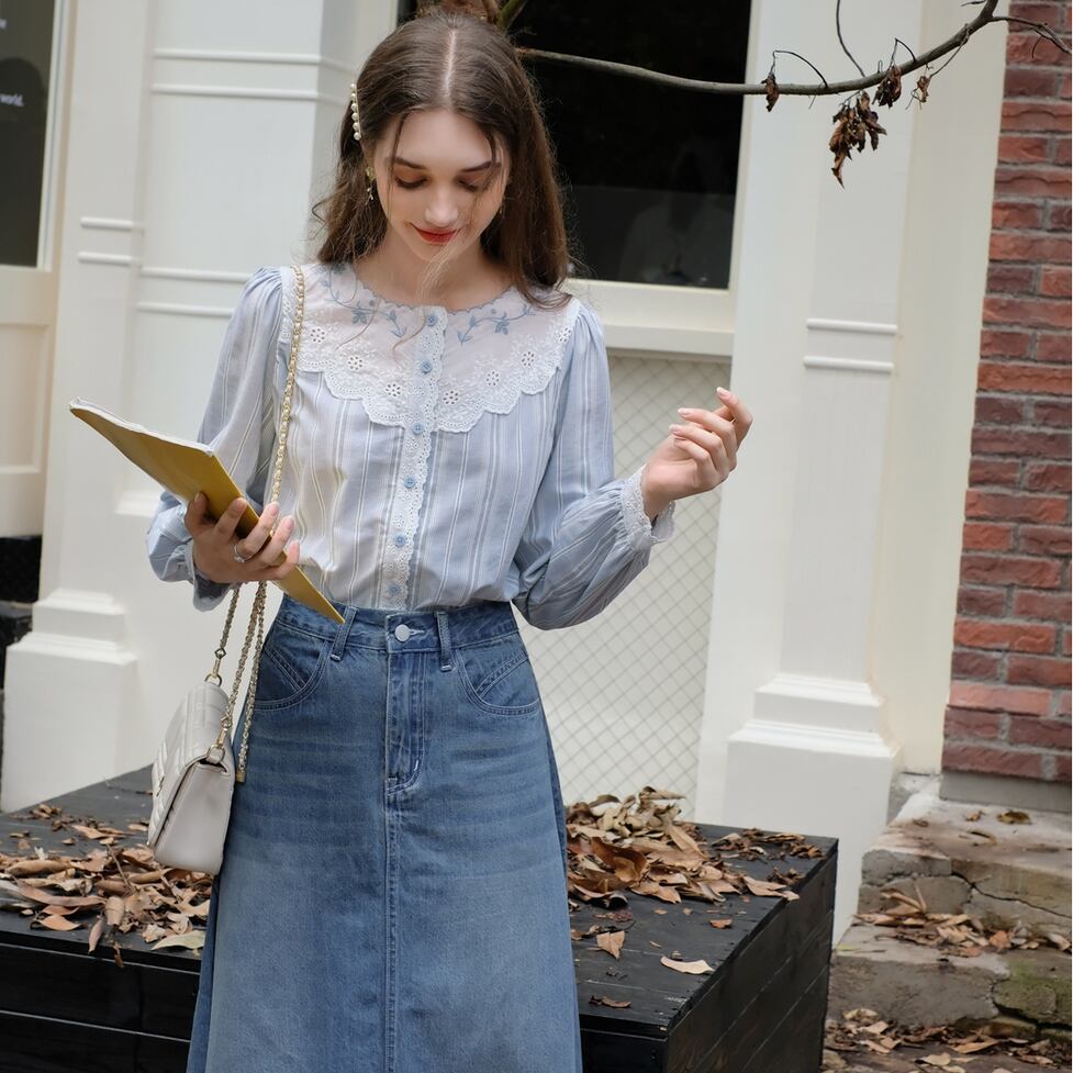 カットワークレースとストライプの融合が可愛らしさを引き出すノーカラーシャツ。ドレッシーな雰囲気を醸し出すカジュアルとキレイが調和したコーディネート。スマートにオシャレ見えさせバランスアップすることで上品な印象作りにもひと役
