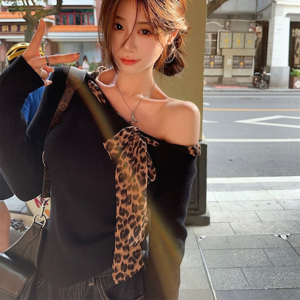ワンショルダーにレオパード柄のリボンがガーリーでかっこいいトップスです。ドレッシーな雰囲気を醸し出すカジュアルとキレイが調和したコーディネート。スマートにオシャレ見えさせバランスアップすることで上品な印象作りにもひと役