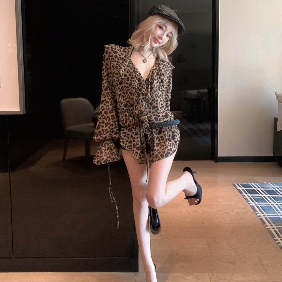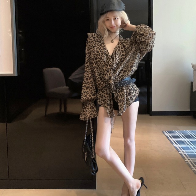 レオパードオーバーシフォンシャツ ヒョウ柄ビッグシフォンフリルシャツ レディース トップス シャツ ブラウス ドロップショルダー バルーン袖 ボリューム袖 長袖 Vネック 襟付き オーバーサイズ フレア ワイド シフォン フリル シアー かわいい 大人可愛い きれいめ カジュアル おしゃれ かっこいい レトロ こなれ感 ラフ マニッシュ ガーリー ルーズ クール エレガント キュート ワイルド ヒョウ柄 レオパード プリント 総柄 体型カバー ゆったり フェミニン