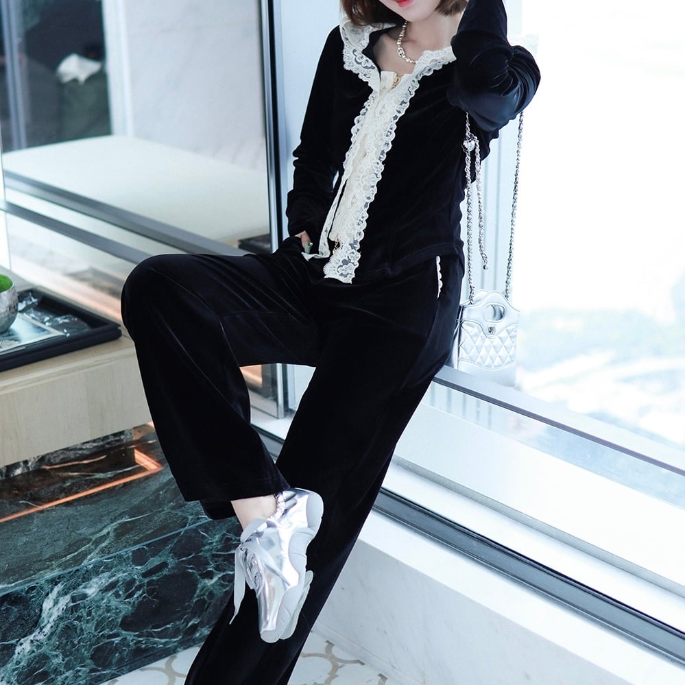 2セット セットアップ レディース トップス パンツ ボトムス ルームウェア パジャマ ジャージ 部屋着 フード付き ストレートパンツ 長袖 萌袖 フード レース付き ジップアップ タイト スリム 細身 セパレート 2way ジッパー チャック 異素材ミックス かわいい 大人可愛い きれいめ シンプル 上品 おしゃれ レトロ ラフ ガーリー エレガント 主役級 存在感 都会的 無地 春 秋 冬 ロングシーズン お泊まり 公園 女子会 休日 重ね着 お揃い 双子 楽ちん レイヤード サイズ展開 黒 ブラック