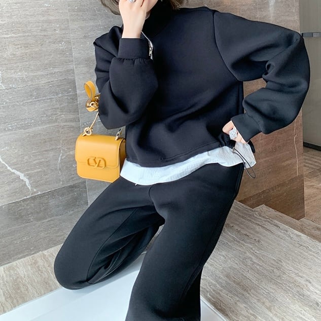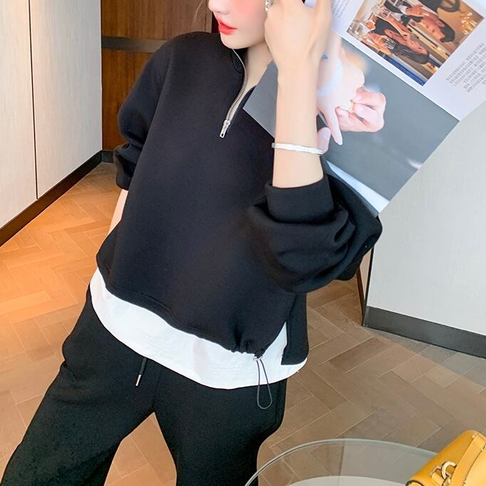 2セット セットアップ レディース トップス パンツ ボトムス ルームウェア パジャマ プルオーバー パーカー トレーナー スウェット ジャージ 部屋着 レイヤード風 ジョガーパンツ スウェットパンツ 長袖 萌袖 ジップアップ ジッパーネック スリム 細身 ストリート スリット サイドスリット サイドジップ ファスナー ドロスト チャック 大人可愛い きれいめ シンプル カジュアル 上品 おしゃれ かっこいい ラフ メンズライク ボーイッシュ スポーティー クール 都会的 クラシカル ワイルド 無地
