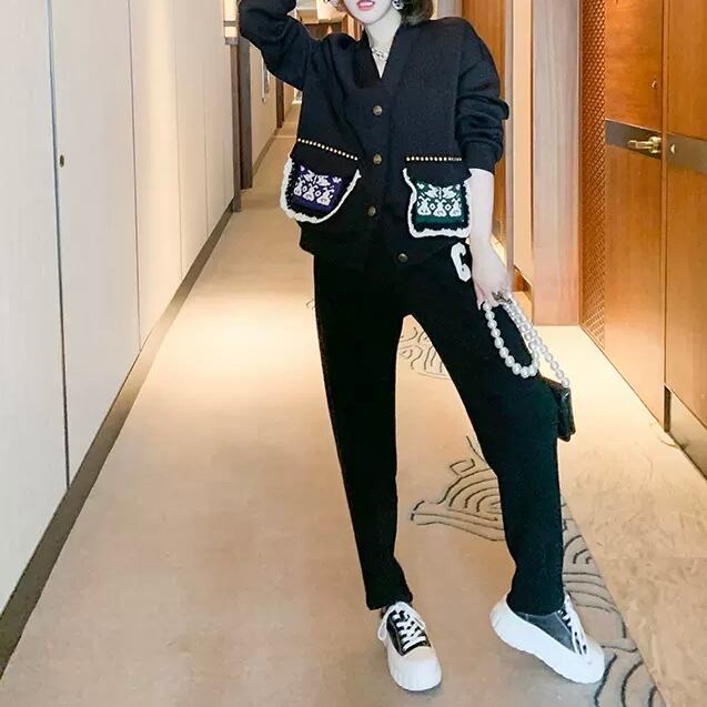 トレンド感満載の前開きカーディガンとジョガーパンツのセットは、カジュアルでありながらも絶妙なエレガントさをプラス。