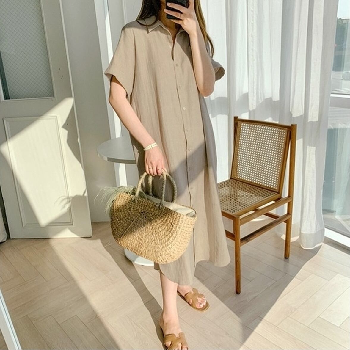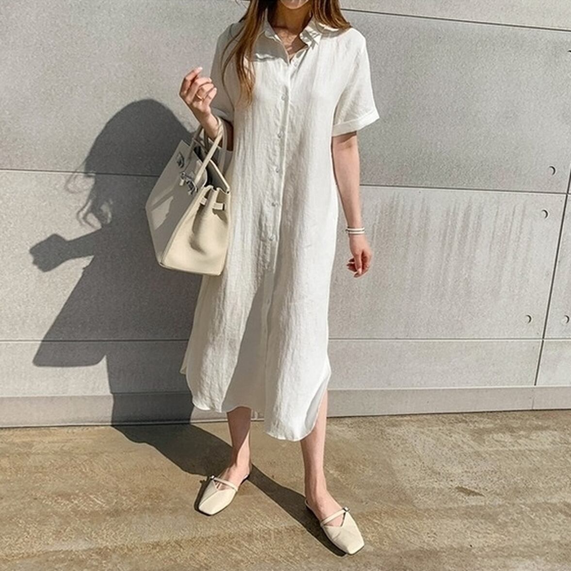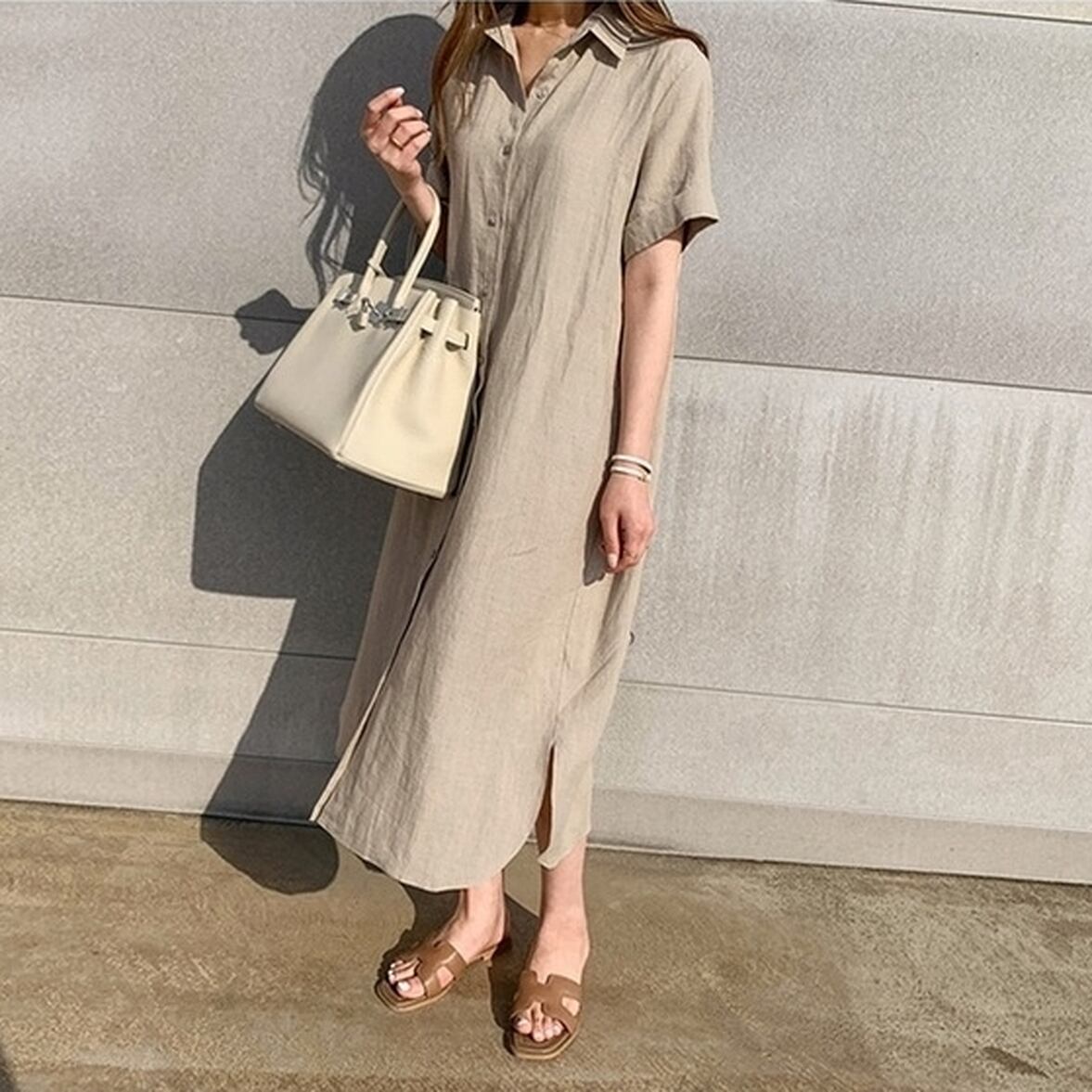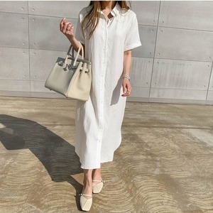 カジュアルなクールビューティを演出する半袖の襟付きロングシャツワンピース。穏やかなテンションに寄り添いながらも華やぐ装いとキレイめなイメージを実現。1枚でも成り立つので組み合わせを考えなくてもいいからこそ着こなしの自由度が高いアイテム