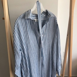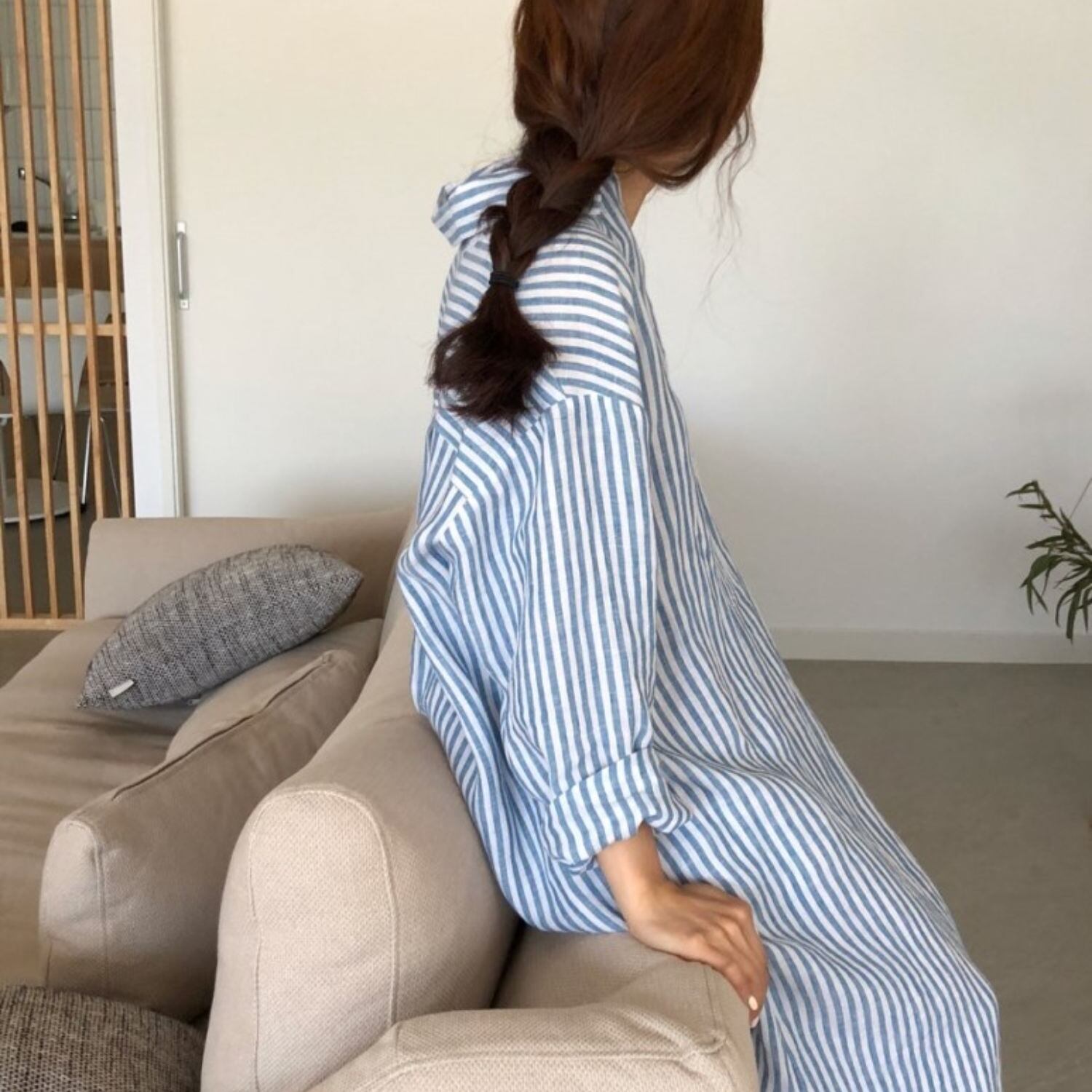 緩めのシルエットが滑らかなショルダーラインとラフな大人スタイルを演出するストライプ柄シャツワンピース。穏やかなテンションに寄り添いながらも華やぐ装いとキレイめなイメージを実現。1枚でも成り立つので組み合わせを考えなくてもいいからこそ着こなしの自由度が高いアイテム