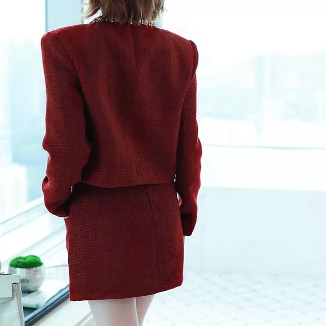 前開きのジャケットとタイトスカートが絶妙に組み合わさった一品で、