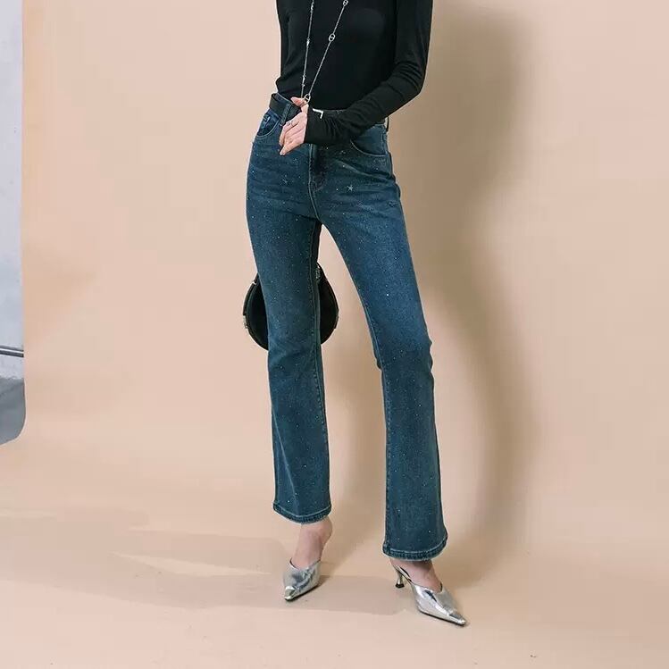 大人可愛いデニムパンツ。スターチャームとストーンが施された個性的なデザインが魅力。