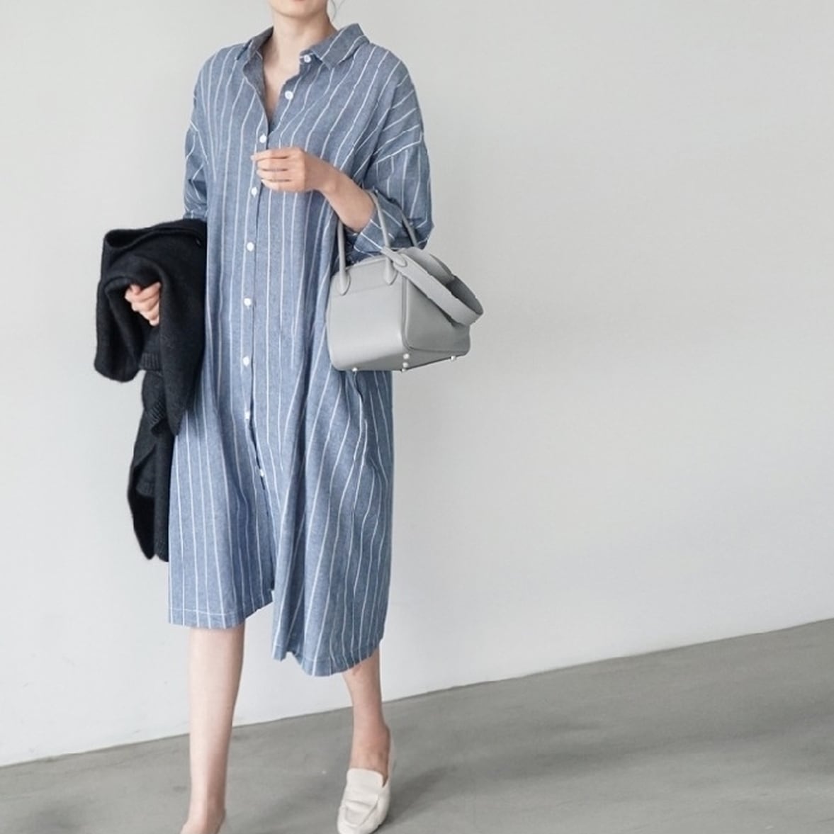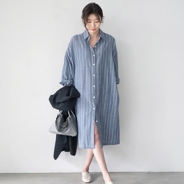 動きやすさ抜群のひざ下丈できちんと感とレディな装いを引き出してくれるストライプ型のシャツワンピース。品よく落ち着いたルックスを演出し着くずして遊んでもシャープな印象を損なわず脱力したムードへ転換。コーディネートに悩みたくない日などに役立ちます