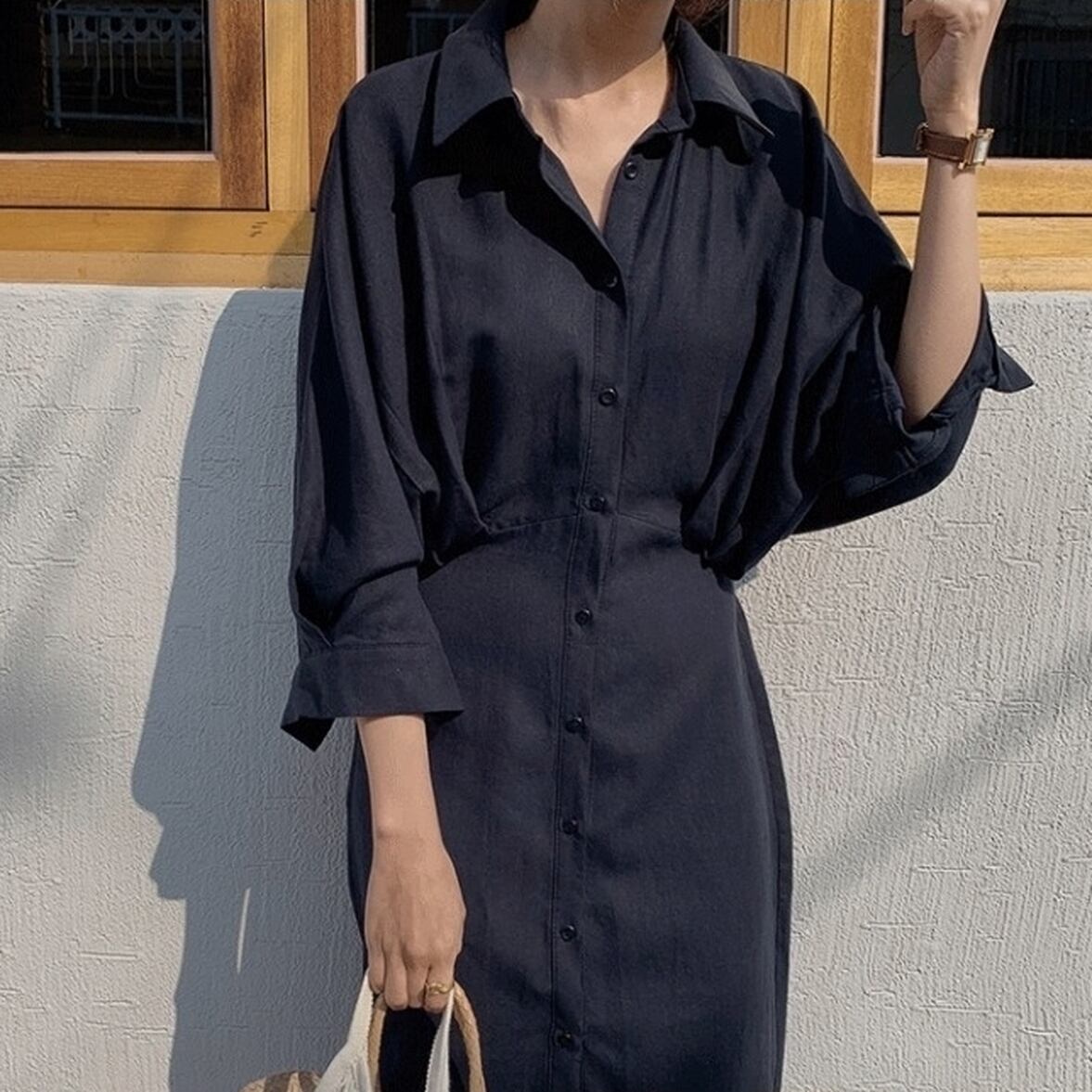 ウエストのタックと融合したラグランスリーブのボリューム感がアクセントのシャツワンピースです。品よく落ち着いたルックスを演出し着くずして遊んでもシャープな印象を損なわず脱力したムードへ転換。コーディネートに悩みたくない日などに役立ちます