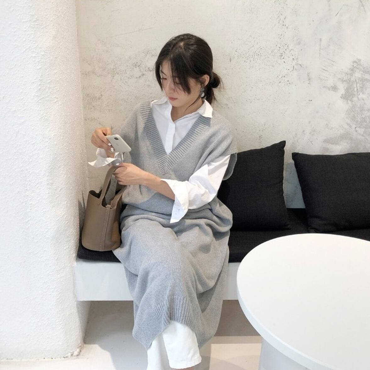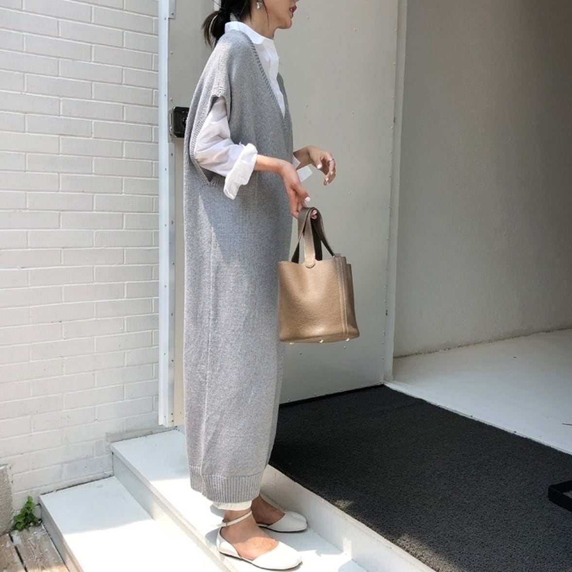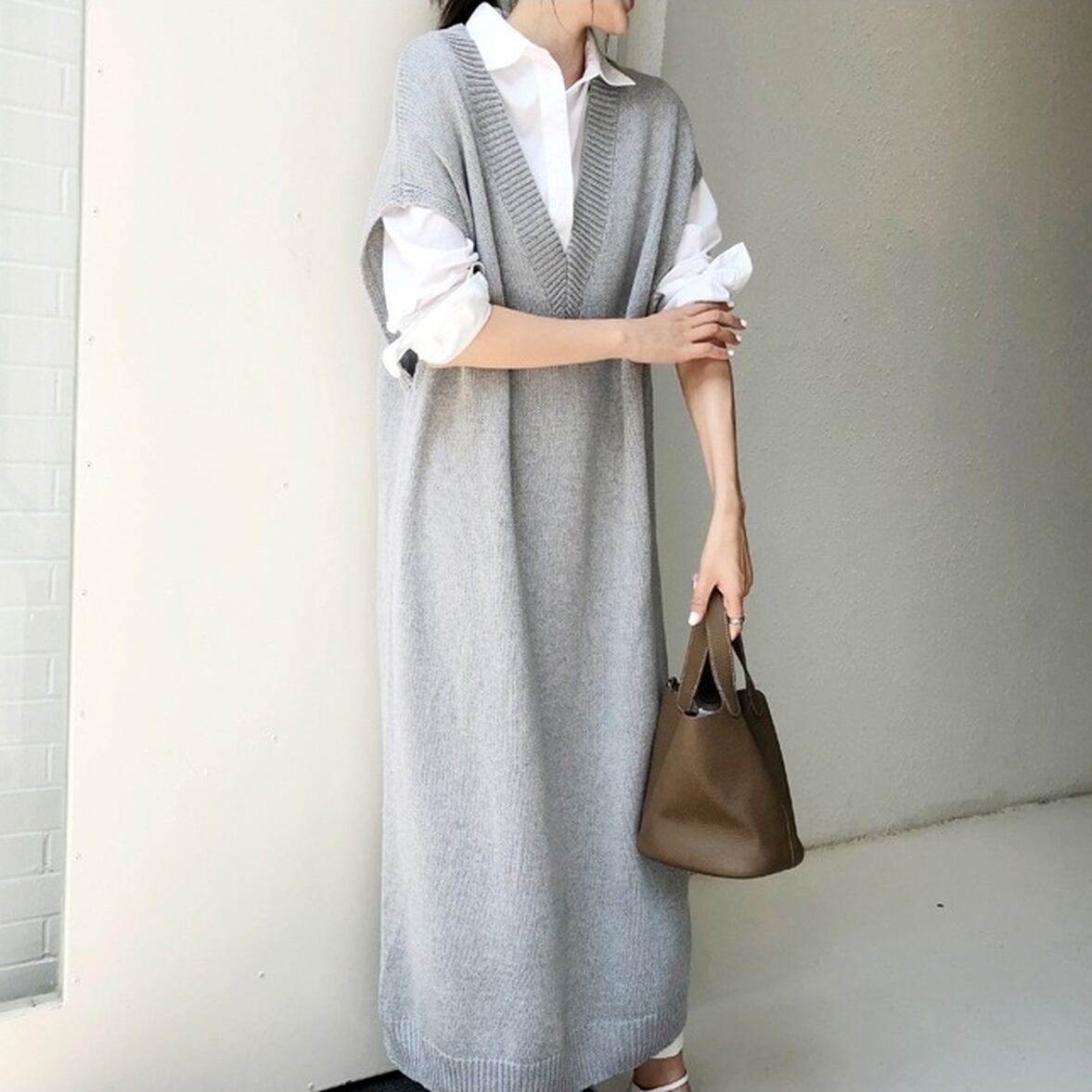 肩を覆うフレンチ袖や重ね着が映える広めのVネックがポイントでストレートシルエットのロングニットベストワンピース。品よく落ち着いたルックスを演出し着くずして遊んでもシャープな印象を損なわず脱力したムードへ転換。コーディネートに悩みたくない日などに役立ちます