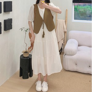 オーバーサイズのロングフレアティアードワンピースとカントリー感を漂わせるベストのセット。着こなしのブラッシュアップを叶えキレイを呼ぶ効果にアプローチ。スタイルアップにも貢献してレディな風格を保てる名品
