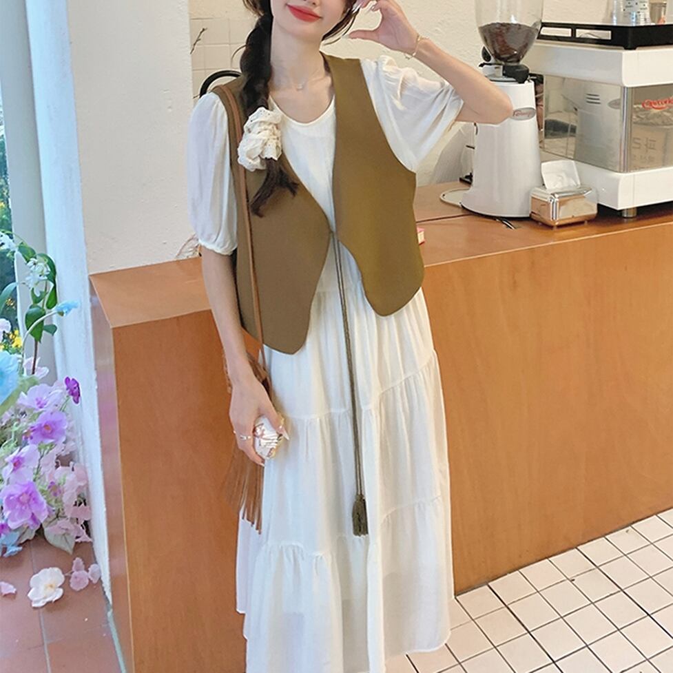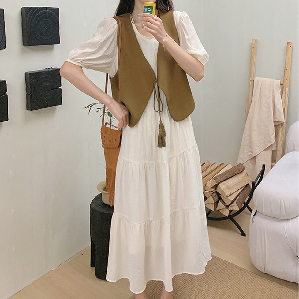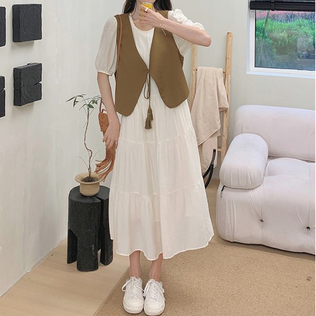 ワンピース+ベストセットアップ ロングフレアティアードワンピース ベストジャケット レディース セットアップ ワンピース ベスト ツーピース 2点セット ティアードワンピース パフスリーブ ロング 半袖 Vネック ラウンドネック フレア オーバーサイズ シフォン かわいい 大人可愛い きれいめ シンプル カジュアル 上品 おしゃれ こなれ感 ガーリー クール エレガント デート お出かけ 休日 ショッピング 体型カバー トレンド インスタ映え ゆったり タイト フェミニン