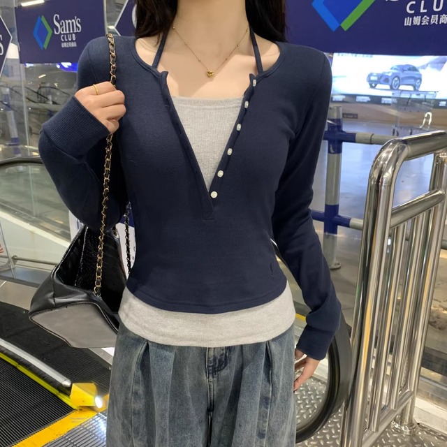 レイヤード風 フロントボタン ロンT レディース トップス カットソー プルオーバー ミディアム 長袖 Vネック ラウンドネック 襟なし スリム 細身 ボタン かわいい 大人可愛い シンプル カジュアル おしゃれ こなれ感 無地 春 秋 冬 ママ 通勤 学生 学校 通学 デート お出かけ 旅行 公園 女子会 休日 ショッピング カフェ 重ね着 普段使い 着回し レイヤード S M L XL ネイビー