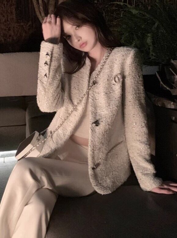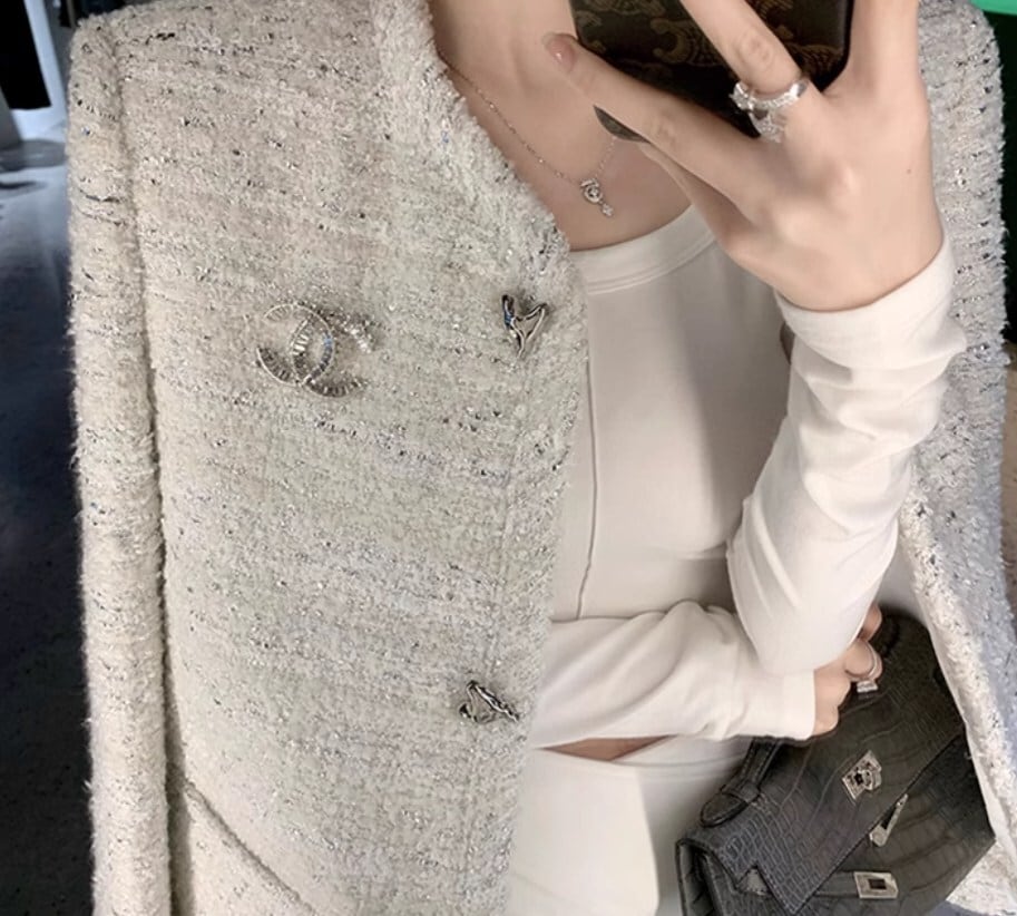 前開きデザインとノーカラーが特徴的で、エレガントさとカジュアル感を兼ね備えています。
