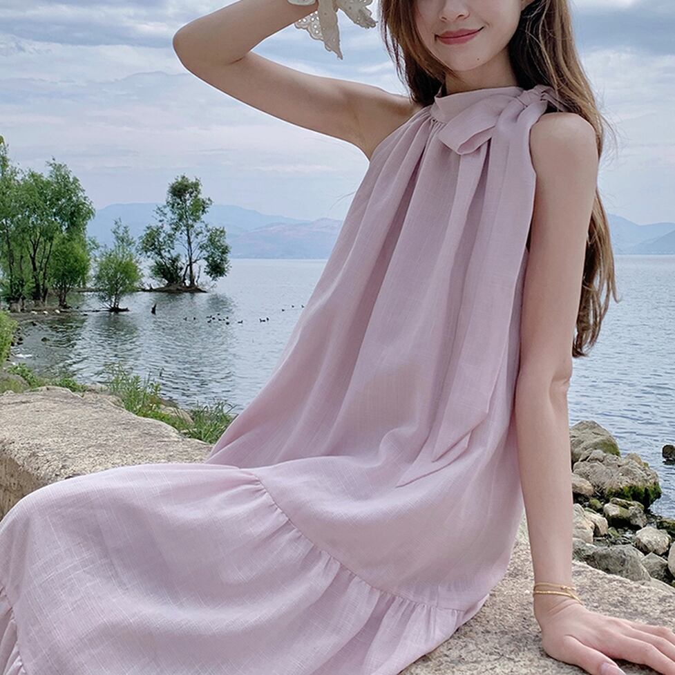 大きなネックのリボンにフレアシルエットが可愛いノースリーブロングワンピースです。体型をカバーしながらもすらりとしたスタイルに見せてくれます。リラクシーな雰囲気が休日やリゾートなどのシーンにマッチします